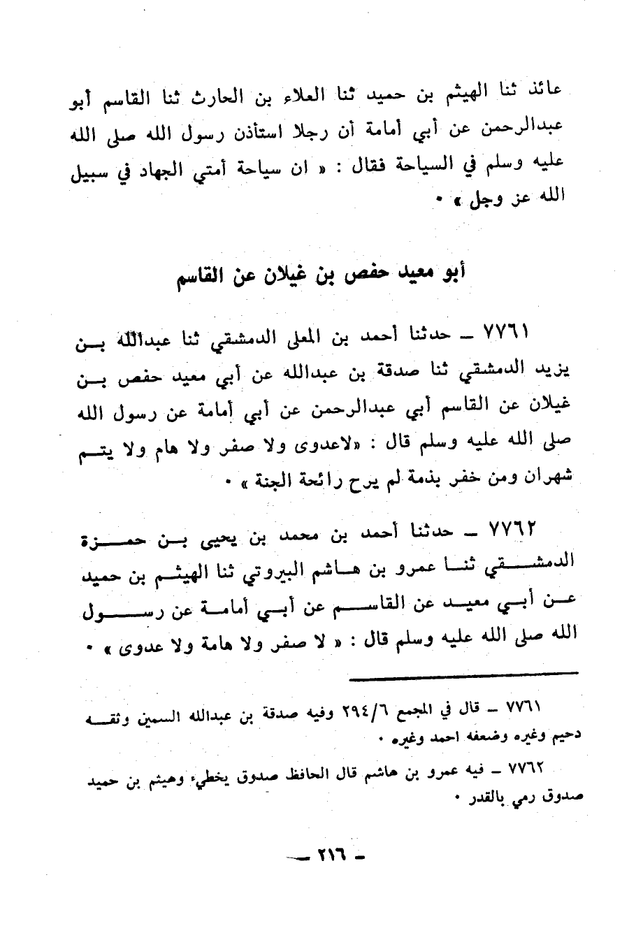 7868 - حَدَّثَنَا أَحْمَدُ بْنُ عَبْدِ الْوَهَّابِ، ثنا أَبُو الْمُغِيرَةِ، ثنا مُعَانُ بْنُ رِفَاعَةَ، أَخْبَرَنِي عَلِيُّ بْنُ يَزِيدَ، عَنِ الْقَاسِمِ، عَنْ أَبِي أُمَامَةَ قَالَ: خَرَجْنَا مَعَ النَّبِيِّ صَلَّى اللهُ عَلَيْهِ وَسَلَّمَ فِي سَرِيَّةٍ مِنْ سَرَايَاهُ، فَمَرَّ رَجُلٌ بِغَارٍ فِيهِ شَيْءٌ مِنْ مَاءٍ، فَجَذَبَتْهُ نَفْسُهُ أَنْ يُقِيمَ فِي ذَلِكَ الْغَارِ، فَيَقُوتَ مَا فِيهِ مِنْ مَاءٍ، وَيُصِيبُ مِمَّا حَوْلَهُ مِنَ الْبَقْلِ، وَيَتَخَلَّى مِنَ الدُّنْيَا، ثُمَّ قَالَ: لَوْ أَنِّي أَتَيْتُ نَبِيَّ اللهِ صَلَّى اللهُ عَلَيْهِ وَسَلَّمَ، فَذَكَرْتُ ذَلِكَ لَهُ، فَإِنْ أَذِنَ لِي فَعَلْتُ، وَإِلَّا لَمْ أَفْعَلْ. فَأَتَاهُ، فَقَالَ: يَا نَبِيَّ اللهِ، إِنِّي مَرَرْتُ بِغَارٍ فِيهِ مَا يَقُوتُنِي مِنَ الْمَاءِ وَالْبَقْلِ، فَحَدَّثَتْنِي نَفْسِي بِأَنْ أُقِيمَ، وَأَتَخَلَّى مِنَ الدُّنْيَا، فَقَالَ النَّبِيُّ صَلَّى اللهُ عَلَيْهِ وَسَلَّمَ: «إِنِّي لَمْ أُبْعَثْ بِالْيَهُودِيَّةِ وَلَا النَّصْرَانِيَّةِ، وَلَكِنِّي بُعِثْتُ بِالْحَنِيفِيَّةِ السَّمْحَةِ، وَالَّذِي نَفْسِي بِيَدِهِ، §لَغَدَاةٌ أَوْ رَوْحَةٌ فِي سَبِيلِ اللهِ خَيْرٌ مِنَ الدُّنْيَا وَمَا فِيهَا، وَلَمَقَامُ أَحَدِكُمْ فِي الصَّفِّ خَيْرٌ مِنْ صَلَاتِهِ سِتِّينَ سَنَةً»