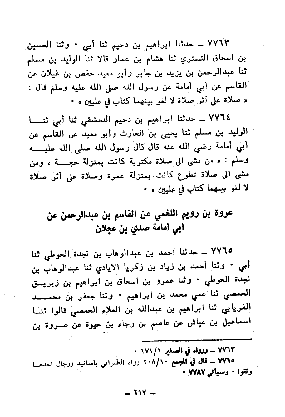 7871 - حَدَّثَنَا أَحْمَدُ بْنُ عَبْدِ الْوَهَّابِ، ثنا أَبُو الْمُغِيرَةِ، ثنا مُعَانُ بْنُ رِفَاعَةَ، ثنا عَلِيُّ بْنُ يَزِيدَ، عَنِ الْقَاسِمِ، عَنْ أَبِي أُمَامَةَ قَالَ: كَانَ رَسُولُ اللهِ صَلَّى اللهُ عَلَيْهِ وَسَلَّمَ جَالِسًا، وَكَانُوا يَظُنُّونَ الْوَحْيَ يَنْزِلُ عَلَيْهِ، فَأَقْصَرُوا عَنْهُ حَتَّى جَاءَ أَبُو ذَرٍّ، فَافْتَحَمَ فَأَتَاهُ فَجَلَسَ إِلَيْهِ فَأَقْبَلَ عَلَيْهِ، فَقَالَ: «يَا أَبَا ذَرٍّ هَلْ صَلَّيْتَ الْيَوْمَ؟» قَالَ: لَا. قَالَ: «قُمْ فَصَلِّ» . فَلَمَّا صَلَّى أَرْبَعَ رَكَعَاتِ الضُّحَى، أَقْبَلَ عَلَيْهِ فَقَالَ: «يَا أَبَا ذَرٍّ، هَلْ تَعَوَّذْتَ مِنْ شَرِّ شَيَاطِينِ الْجِنِّ وَالْإِنْسِ؟» قَالَ: يَا نَبِيَّ اللهِ، وَهَلْ لِلْإِنْسِ شَيَاطِينُ؟ قَالَ: «نَعَمْ، §شَيَاطِينُ الْإِنْسِ وَالْجِنِّ يُوحِي بَعْضُهُمْ إِلَى بَعْضٍ زُخْرُفَ الْقَوْلِ غُرُورًا»
