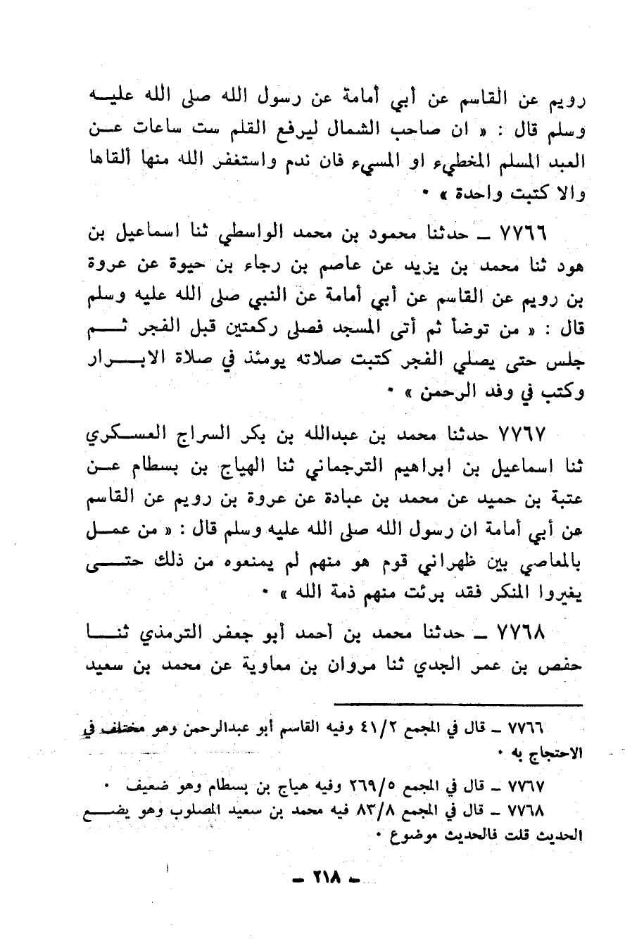 7872 - حَدَّثَنَا جَعْفَرُ بْنُ مُحَمَّدٍ الْفِرْيَابِيُّ، ثنا سُلَيْمَانُ بْنُ عَبْدِ الرَّحْمَنِ الدِّمَشْقِيُّ، ثنا الْوَلِيدُ بْنُ مُسْلِمٍ، حَدَّثَنِي مُعَانُ بْنُ رِفَاعَةَ، عَنْ عَلِيِّ بْنِ يَزِيدَ، عَنِ الْقَاسِمِ، عَنْ أَبِي أُمَامَةَ، عَنْ رَسُولِ اللهِ صَلَّى اللهُ عَلَيْهِ وَسَلَّمَ قَالَ: «§مَنْ صَامَ يَوْمًا فِي سَبِيلِ اللهِ بَعَّدَ اللهُ بَيْنَهُ، وَبَيْنَ جَهَنَّمَ مَسِيرَةَ مِائَةِ عَامٍ»