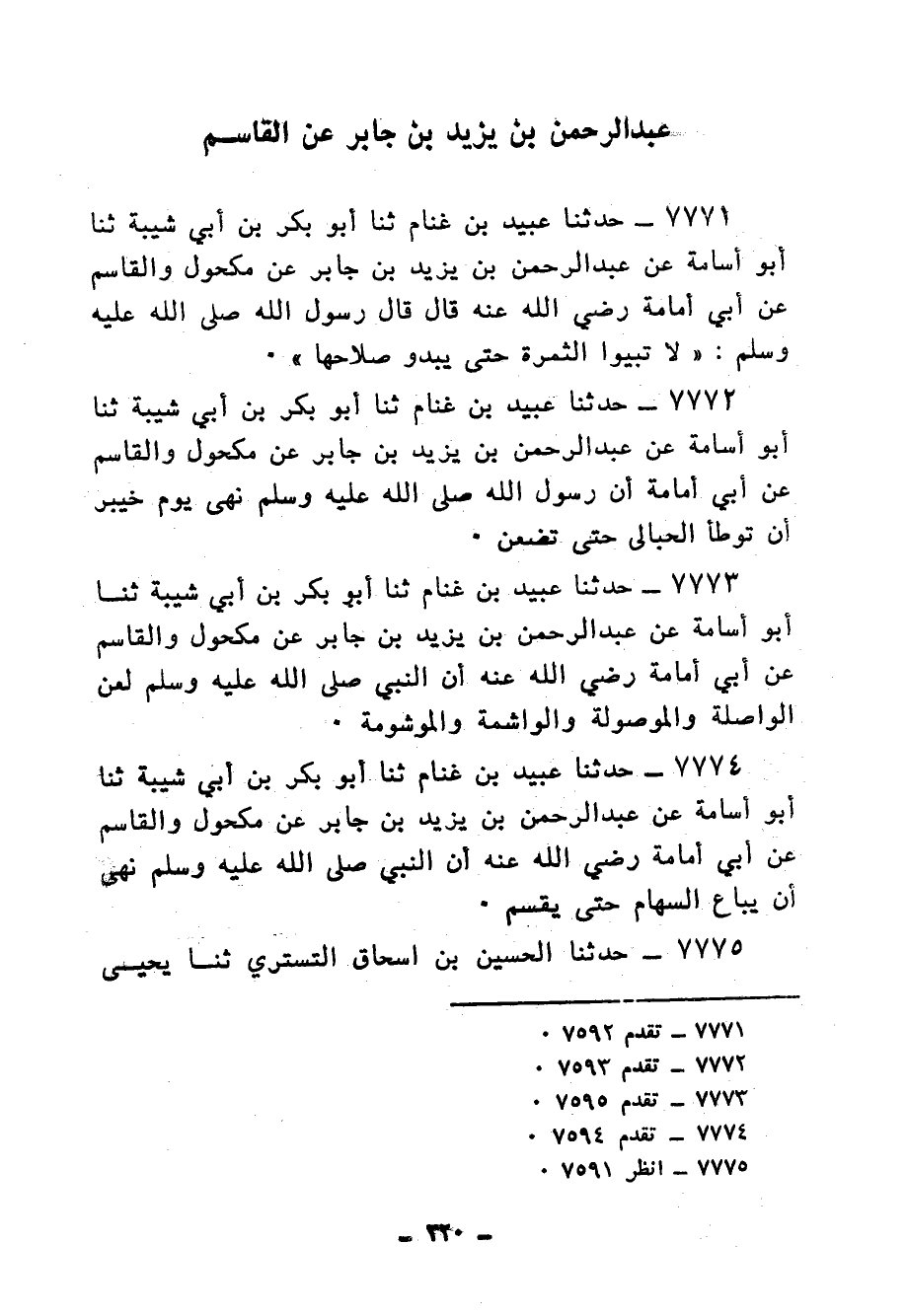 7875 - حَدَّثَنَا مُحَمَّدُ بْنُ عَبْدُوسِ بْنِ جَرِيرٍ الصُّورِيُّ، ثنا سُلَيْمَانُ بْنُ عَبْدِ الرَّحْمَنِ الدِّمَشْقِيُّ، ثنا الْوَلِيدُ بْنُ مُسْلِمٍ، ثنا عُثْمَانُ بْنُ أَبِي الْعَاتِكَةِ، عَنْ عَلِيِّ بْنِ يَزِيدَ، عَنِ الْقَاسِمِ، عَنْ أَبِي أُمَامَةَ، أَنَّ رَسُولَ اللهِ صَلَّى اللهُ عَلَيْهِ وَسَلَّمَ قَالَ: «يَا أَيُّهَا النَّاسُ، §عَلَيْكُمْ بِالْعِلْمِ قَبْلَ أَنْ يُقْبَضَ، الْعَالِمُ وَالْمُتَعَلِّمُ شَرِيكَانَ فِي الْأَجْرِ، وَلَا خَيْرَ فِي سَائِرِ النَّاسِ»