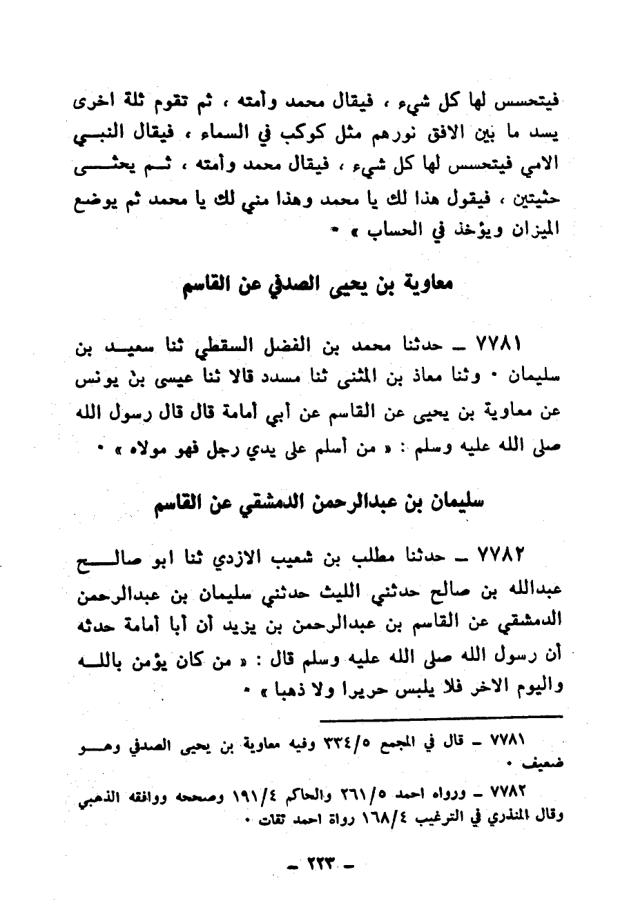 7884 - حَدَّثَنَا الْحُسَيْنُ بْنُ إِسْحَاقَ التُّسْتَرِيُّ، ثنا هِشَامُ بْنُ عَمَّارٍ، ثنا مُحَمَّدُ بْنُ شُعَيْبِ بْنِ شَابُورٍ، ثنا عُثْمَانُ بْنُ أَبِي الْعَاتِكَةِ، عَنْ عَلِيِّ بْنِ يَزِيدَ، عَنِ الْقَاسِمِ، عَنْ أَبِي أُمَامَةَ قَالَ: خَرَجَ النَّبِيُّ صَلَّى اللهُ عَلَيْهِ وَسَلَّمَ ذَاتَ يَوْمٍ وَمَعَهُ أَبُو بَكْرٍ، وَعُمَرُ، وَزَيْدُ بْنُ ثَابِتٍ، وَعَبْدُ اللهِ بْنُ مَسْعُودٍ، وَأُبَيُّ بْنُ كَعْبٍ، وَعَبْدُ اللهِ بْنُ عَبَّاسٍ وَالنَّبِيُّ صَلَّى اللهُ عَلَيْهِ وَسَلَّمَ عَلَى رَاحِلَتِهِ الْجَدْعَاءِ، فَلَمَّا بَرَزُوا سَمِعَ النَّبِيُّ صَلَّى اللهُ عَلَيْهِ وَسَلَّمَ رَجُلًا يَقُولُ: اللهُ أَكْبَرُ اللهُ أَكْبَرُ، فَوَقَفَ يَسْتَمِعُ، فَلَمَّا قَالَ: §اللهُ أَكْبَرُ، اللهُ أَكْبَرُ، قَالَ رَسُولُ اللهِ صَلَّى اللهُ عَلَيْهِ وَسَلَّمَ: «شَهِدَ هَذَا، وَالَّذِي نَفْسِي بِيَدِهِ بِشَهَادَةِ الْحَقِّ» . فَلَمَّا قَالَ: أَشْهَدُ أَنْ لَا إِلَهَ إِلَّا اللهُ، قَالَ: «بَرِئَ هَذَا، وَالَّذِي نَفْسِي بِيَدِهِ مِنَ النَّارِ» ثَلَاثَ مَرَّاتٍ، ثُمَّ قَالَ رَسُولُ اللهِ صَلَّى اللهُ عَلَيْهِ وَسَلَّمَ: «هَذَا صَاحِبُ كِلَابٍ» . فَذَهَبَ ابْنُ مَسْعُودٍ وَابْنُ عَبَّاسٍ، فَوَجَدُوهُ كَذَلِكَ