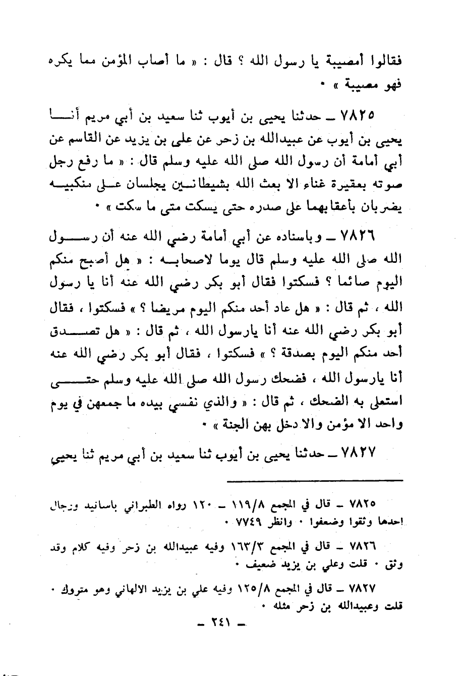 7941 - حَدَّثَنَا إِبْرَاهِيمُ بْنُ صَالِحٍ الشِّيرَازِيُّ، ثنا عُثْمَانُ بْنُ الْهَيْثَمِ، ثنا جَعْفَرُ بْنُ الزُّبَيْرِ، عَنِ الْقَاسِمِ، عَنْ أَبِي أُمَامَةَ، عَنِ النَّبِيِّ صَلَّى اللهُ عَلَيْهِ وَسَلَّمَ قَالَ: «إِنَّ §أَوَّلَ قَطْرَةٍ تَقْطُرُ مِنْ دَمِ الشَّهِيدِ تُكَفَّرُ بِهَا ذُنُوبُهُ، وَالثَّانِيَةُ يُكْسَى حُلَلَ الْإِيمَانِ، وَالثَّالِثَةُ يُزَوَّجُ مِنَ الْحُورِ الْعِينِ»