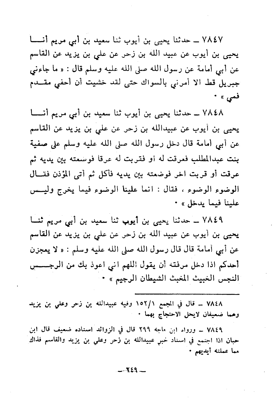 7977 - حَدَّثَنَا عَبْدُ اللهِ بْنُ أَحْمَدَ بْنِ حَنْبَلٍ، ثنا أَبِي أَحْمَدَ بْنِ حَنْبَلٍ، ثنا مُحَمَّدُ بْنُ سُلَيْمَانَ لُوَيْنَ، ثنا بَقِيَّةُ بْنُ الْوَلِيدِ، حَدَّثَنِي عُمَرُ بْنُ مُوسَى، حَدَّثَنِي الْقَاسِمُ، عَنْ أَبِي أُمَامَةَ، عَنِ النَّبِيِّ صَلَّى اللهُ عَلَيْهِ وَسَلَّمَ قَالَ: «§الْأَكْلُ فِي السُّوقِ دَنَاءَةٌ»