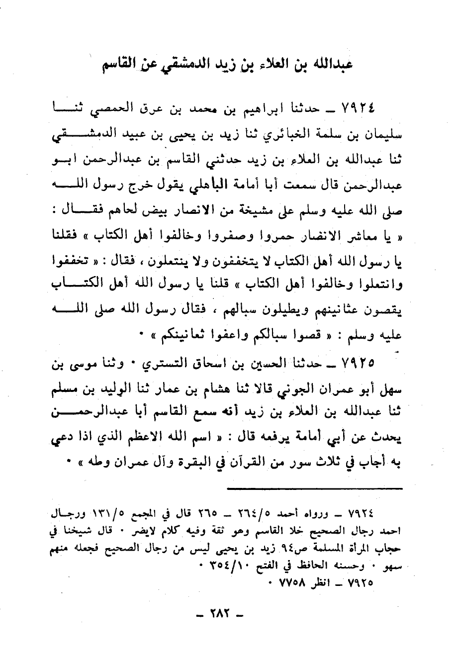 8082 - حَدَّثَنَا أَحْمَدُ بْنُ النَّضْرِ الْعَسْكَرِيُّ، ثنا سَعِيدُ بْنُ حَفْصٍ النُّفَيْلِيُّ، ثنا الْعَلَاءُ بْنُ سُلَيْمَانَ الرَّقِّيُّ، عَنِ الْخَلِيلِ بْنِ مُرَّةَ، عَنْ أَبِي غَالِبٍ، عَنْ أَبِي أُمَامَةَ قَالَ: قَالَ رَسُولُ اللهِ صَلَّى اللهُ عَلَيْهِ وَسَلَّمَ: «§اضْمَنُوا لِي سِتَّ خِصَالٍ أَضْمَنُ لَكُمِ الْجَنَّةَ» . قَالُوا: وَمَا هُنَّ يَا رَسُولَ اللهِ؟ قَالَ: «لَا تَظْلِمُوا عِنْدَ قِسْمَةِ مَوَارِيثِكُمْ، وَأَنْصِفُوا النَّاسَ مِنْ أَنْفُسِكُمْ، وَلَا تَجْبُنُوا عِنْدَ قِتَالِ عَدُوِّكُمْ، وَلَا تَغُلُّوا غَنَائِمَكُمْ، وَامْنَعُوا ظَالِمَكُمْ مِنْ مَظْلُومِكُمْ»
