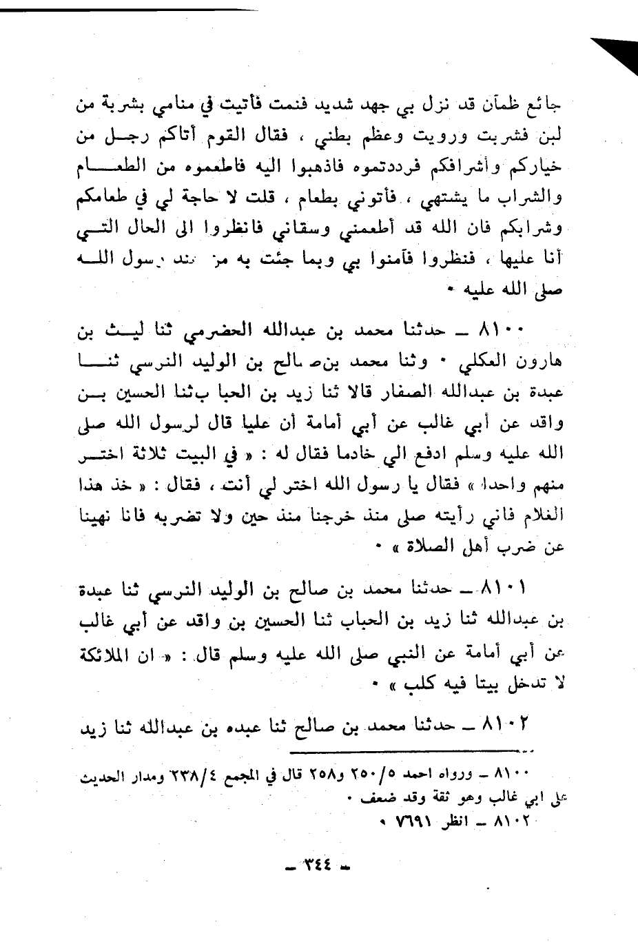 8101- حَدَّثَنَا مُحَمَّدُ بْنُ صَالِحِ بْنِ الْوَلِيدِ النَّرْسِيُّ ، حَدَّثَنَا عَبْدَةُ بْنُ عَبْدِ اللهِ ، حَدَّثَنَا زَيْدُ بْنُ الْحُبَابِ ، حَدَّثَنَا الْحُسَيْنُ بْنُ وَاقِدٍ ، عَنْ أَبِي غَالِبٍ ، عَنْ أَبِي أُمَامَةَ ، عَنِ النَّبِيِّ صَلَّى اللَّهُ عَلَيْهِ وَسَلَّمَ ، قَالَ : إِنَّ الْمَلاَئِكَةَ لاَ تَدْخُلُ بَيْتًا فِيهِ كَلْبٌ.