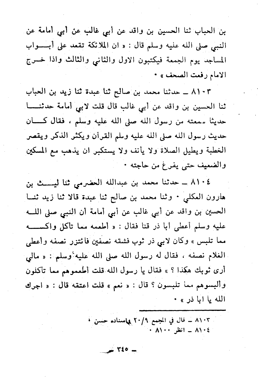 8103- حَدَّثَنَا مُحَمَّدُ بْنُ صَالِحٍ ، حَدَّثَنَا عَبْدَةُ ، حَدَّثَنَا زَيْدُ بْنُ الْحُبَابِ ، حَدَّثَنَا الْحُسَيْنُ بْنُ وَاقِدٍ ، عَنْ أَبِي غَالِبٍ ، قَالَ : قُلْتُ لأَبِي أُمَامَةَ : حَدِّثْنَا حَدِيثًا سَمِعْتَهُ مِنْ رَسُولِ اللهِ صَلَّى اللَّهُ عَلَيْهِ وَسَلَّمَ ، فَقَالَ : كَانَ حَدِيثُ رَسُولِ اللهِ صَلَّى اللَّهُ عَلَيْهِ وَسَلَّمَ الْقُرْآنَ ، وَيُكْثِرُ الذِّكْرَ ، وَيُقَصِّرُ الْخُطْبَةَ ، وَيُطِيلُ الصَّلاَةَ ، وَلاَ يَأْنَفْ ، وَلاَ يَسْتَكْبِرْ أَنْ يَذْهَبَ مَعَ الْمِسْكِينِ وَالضَّعِيفِ حَتَّى يَفْرُغَ مِنْ حَاجَتِهِ.