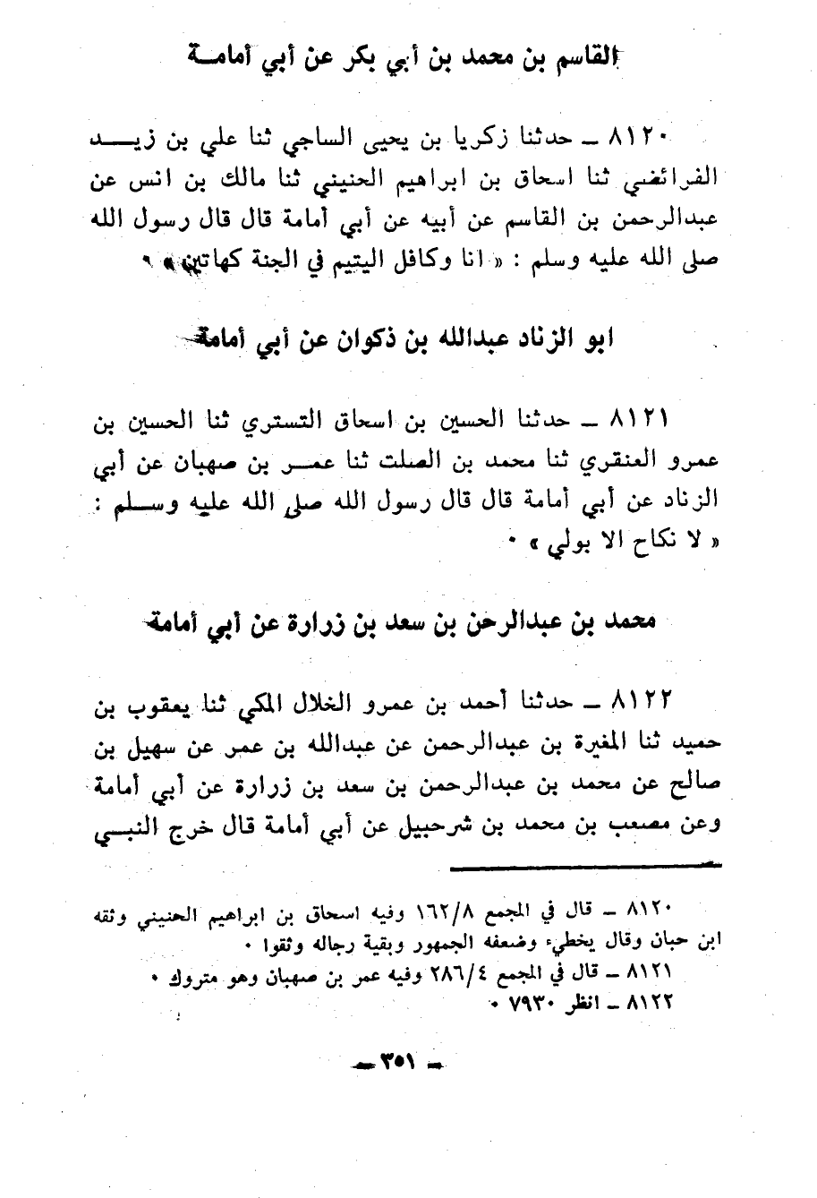 8120- حَدَّثَنَا زَكَرِيَّا بْنُ يَحْيَى السَّاجِيُّ ، حَدَّثَنَا عَلِيُّ بْنُ زَيْدٍ الْفَرَائِضِيُّ ، حَدَّثَنَا إِسْحَاقُ بْنُ إِبْرَاهِيمَ الْحُنَيْنِيُّ ، حَدَّثَنَا مَالِكُ بْنُ أَنَسٍ ، عَنْ عَبْدِ الرَّحْمَنِ بْنِ الْقَاسِمِ ، عَنْ أَبِيهِ ، عَنْ أَبِي أُمَامَةَ ، قَالَ : قَالَ رَسُولُ اللهِ صَلَّى اللَّهُ عَلَيْهِ وَسَلَّمَ : أَنَا وَكَافِلُ الْيَتِيمِ فِي الْجَنَّةِ كَهَاتَيْنِ.