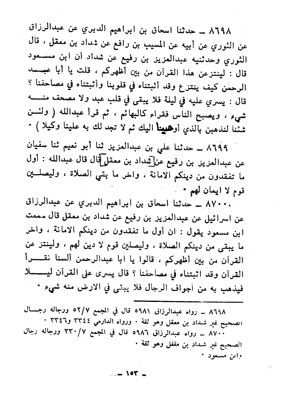 8769 - حَدَّثَنَا مُعَاذُ بْنُ الْمُثَنَّى، ثنا مُسَدَّدٌ، ثنا يَحْيَى بْنُ مَنْصُورٍ، عَنْ سُفْيَانَ، عَنْ سُلَيْمَانَ الْأَعْمَشِ، عَنْ مَالِكِ بْنِ الْحَارِثِ، عَنْ عَبْدِ الرَّحْمَنِ بْنِ يَزِيدَ، عَنْ عَبْدِ اللهِ، مِثْلَ حَدِيثِ زَائِدَةَ
