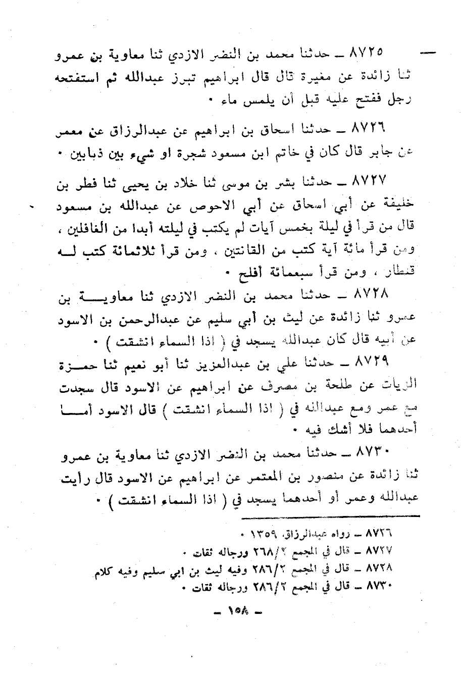 8793 - حَدَّثَنَا إِسْحَاقُ بْنُ إِبْرَاهِيمَ، عَنْ عَبْدِ الرَّزَّاقِ، عَنْ مَعْمَرٍ، عَنِ الْأَعْمَشِ، قَالَ: كَانَ ابْنُ مَسْعُودٍ جَالِسًا بَعْدَ الصُّبْحِ فِي حَلْقَةٍ، فَقَالَ: «§أَنْشُدُ اللهَ قَاطَعَ رَحِمٍ لَمَا قَامَ عَنَّا، فَإِنَّا نُرِيدُ أَنْ نَدْعُوَ رَبَّنَا، وَأَبْوَابُ السَّمَاءِ مُرْتَجَةٌ دُونَ قَاطَعِ رَحِمٍ»