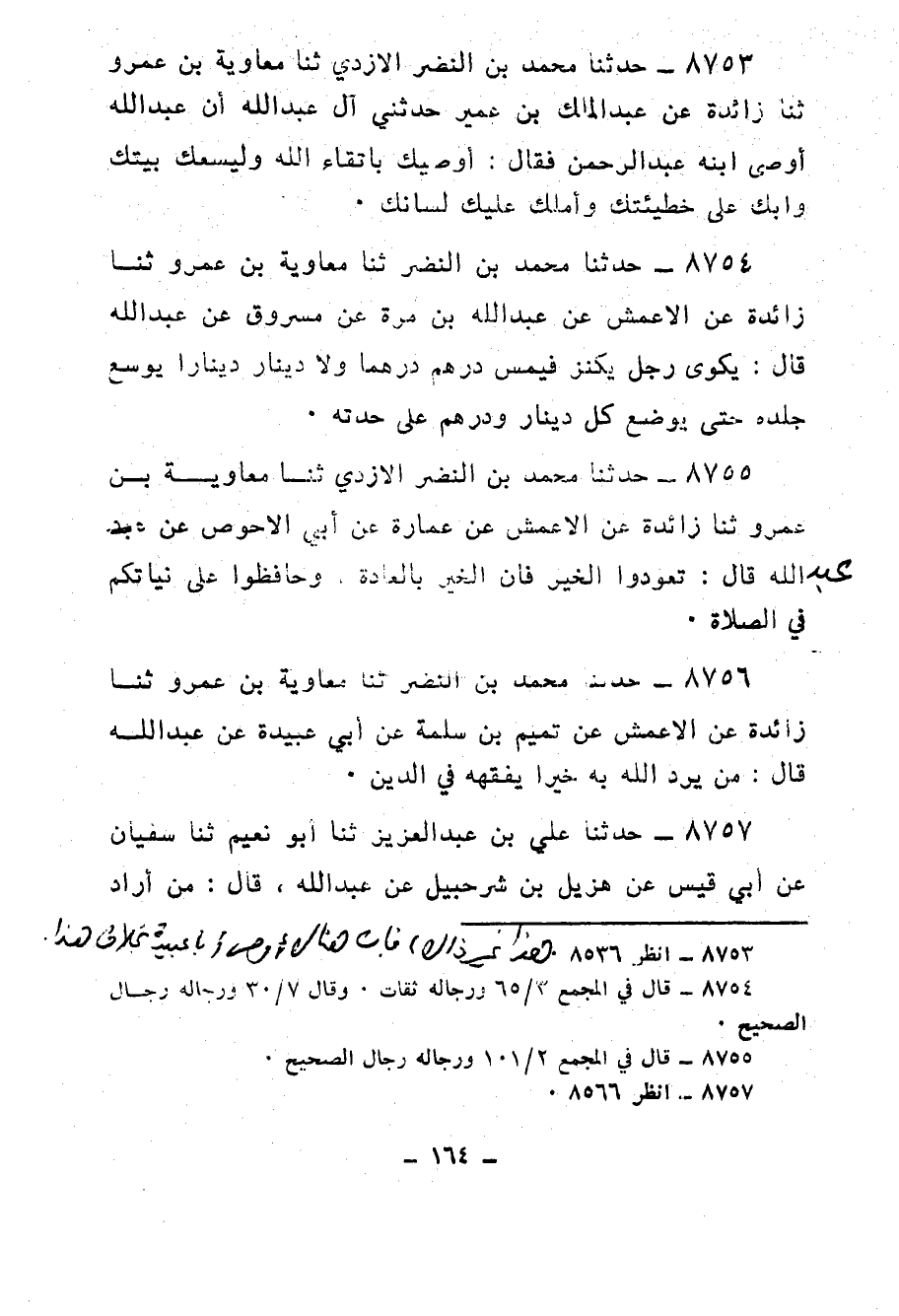 8813 - حَدَّثَنَا مُحَمَّدُ بْنُ النَّضْرِ الْأَزْدِيُّ، ثنا مُعَاوِيَةُ بْنُ عَمْرٍو، ثنا زَائِدَةُ، عَنْ عَاصِمٍ، عَنْ زِرٍّ، عَنْ عَبْدِ اللهِ، قَالَ: «§إِذَا ذُكِرَ الصَّالِحُونَ فَحَيَّ هَلَا بِعُمَرَ، إِنَّ إِسْلَامَهُ كَانَ نَصْرًا، وَإِنَّ إِمَارَتَهُ كَانَتْ فَتْحًا، وَايْمُ اللهِ مَا أَعْلَمُ عَلَى الْأَرْضِ شَيْئًا إِلَّا، وَقَدْ وَجَدَ فَقْدَ عُمَرَ حَتَّى الْعِضَاهَ، وَايْمُ اللهِ إِنِّي لَأَحْسِبُ بَيْنَ عَيْنَيْهِ مَلَكًا يُسَدِّدُهُ وَيُرْشِدُهُ، وَايْمُ اللهِ إِنِّي لَأَحْسِبُ الشَّيْطَانَ يَفْرَقُ مِنْهُ أَنْ يُحْدِثَ فِي الْإِسْلَامِ حَدَثًا فَيَرُدَّ عَلَيْهِ عُمَرُ، وَايْمُ اللهِ لَوْ أَعْلَمُ كَلْبًا يُحِبُّ عُمَرَ لَأَحْبَبْتُهُ»