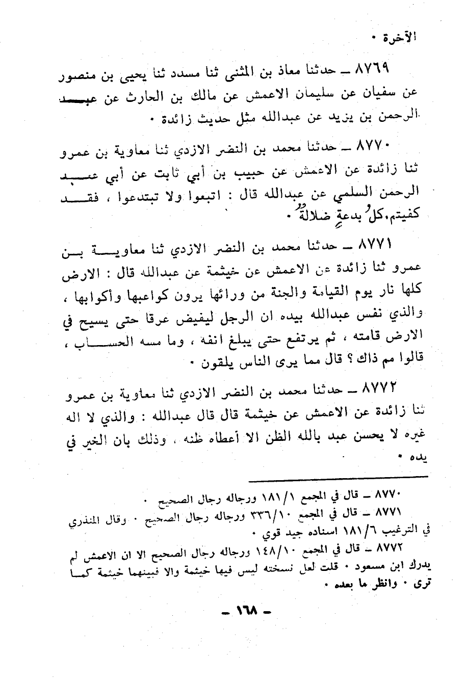 8834 - حَدَّثَنَا مُحَمَّدُ بْنُ النَّضْرِ الْأَزْدِيُّ، ثنا مُعَاوِيَةُ بْنُ عَمْرٍو، ثنا زَائِدَةُ، عَنِ الْأَعْمَشِ، عَنْ شَقِيقٍ، عَنْ عَبْدِ اللهِ، قَالَ: «إِنَّ §عُمَرَ كَرِهَ الصَّلَاةَ بَعْدَ الْعَصْرِ» ، وَأَنَا أَكْرَهُ مَا كَرِهَ عُمَرُ