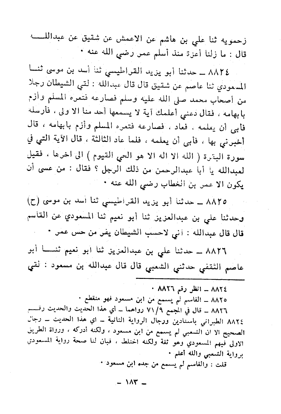 8904 - حَدَّثَنَا أَبُو مُسْلِمٍ الْكَشِّيُّ، ثنا عِصْمَةُ بْنُ سُلَيْمَانَ الْخَزَّازُ الْكُوفِيُّ، ثنا مُحَمَّدُ بْنُ طَلْحَةَ بْنُ مُصَرِّفٍ، عَنْ أَبِيهِ، عَنْ يَزِيدَ بْنِ وَهْبٍ، قَالَ: قَالَ عَبْدُ اللهِ بْنُ مَسْعُودٍ: «§لَا يَتَهَاجَرْ رَجُلَانِ قَدْ دَخَلَا فِي الْإِسْلَامِ إِلَّا خَرَجَ أَحَدُهُمَا مِنْهُ حَتَّى يَرْجِعَ، وَرُجُوعُهُ أَنْ يَأْتِيَهُ فَيُسَلِّمَ عَلَيْهِ»