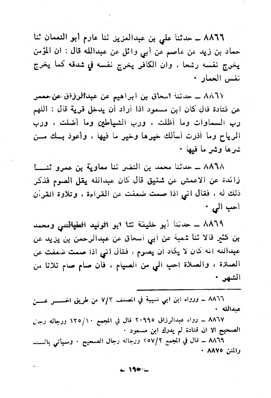 8960 - حَدَّثَنَا عَلِيُّ بْنُ عَبْدِ الْعَزِيزِ، ثنا أَبُو نُعَيْمٍ، ثنا الْمَسْعُودِيُّ، عَنِ الْقَاسِمِ، قَالَ: أُتِيَ عَبْدُ اللهِ، فَقِيلَ لَهُ: يَا أَبَا عَبْدِ الرَّحْمَنِ، إِنَّ هَهُنَا نَاسٌ يَقْرَءُونَ قِرَاءَةَ مُسَيْلِمَةَ، فَرَدَّهُ عَبْدُ اللهِ فَلَبِثَ مَا شَاءَ اللهُ أَنْ يَلْبَثَ، ثُمَّ أَتَاهُ فَقَالَ: وَالَّذِي أَحْلِفُ بِهِ يَا أَبَا عَبْدِ الرَّحْمَنِ، لَقَدْ تَرَكْتُهُمُ الْآنَ فِي دَارٍ، وَإِنَّ ذَلِكَ الْمُصْحَفَ لَعِنْدَهُمْ، فَأَمَرَ قَرَظَةَ بْنَ كَعْبٍ فَسَارَ بِالنَّاسِ مَعَهُ، فَقَالَ: «ائْتِ بِهِمْ» ، فَلَمَّا أَتَى بِهِمْ، قَالَ عَبْدُ اللهِ: «مَا هَذَا بَعْدَ اسْتِفَاضِ الْإِسْلَامِ؟» قَالُوا: يَا أَبَا عَبْدِ الرَّحْمَنِ، نَسْتَغْفِرُ اللهَ، وَنَتُوبُ إِلَيْهِ، وَنَشْهَدُ أَنَّ مُسَيْلِمَةَ هُوَ الْكَذَّابُ الْمُفْتَرِي عَلَى اللهِ وَرَسُولِهِ، قَالَ: فَاسْتَتَابَهُمْ عَبْدُ اللهِ، وَسَيَّرَهُمْ إِلَى الشَّامِ، وَإِنَّهُمْ لَقَرِيبٌ مِنْ ثَمَانِينَ رَجُلًا، وَأَبَى ابْنُ النَّوَّاحَةِ أَنْ يَتُوبَ §فَأَمَرَ بِهِ قَرَظَةَ بْنَ كَعْبٍ فَأَخْرَجَهُ إِلَى السُّوقِ فَضَرَبَ عُنُقَهُ، وَأَمَرَهُ أَنْ يَأْخُذَ رَأْسَهُ فَيُلْقِيَهُ فِي حِجْرِ أُمِّهِ، قَالَ عَبْدُ الرَّحْمَنِ بْنُ عَبْدِ اللهِ: فَلَقِيتُ شَيْخًا مِنْهُمْ كَبِيرًا بَعْدَ ذَلِكَ بِالشَّامِ، فَقَالَ: لِيَرْحَمِ اللهُ أَبَاكَ، وَاللهِ لَوْ قَتَلْنَا يَوْمَئِذٍ لَدَخَلْنَا النَّارَ كُلُّنَا