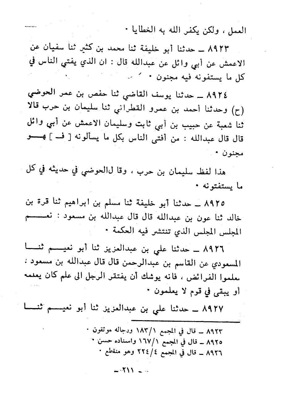 9028 - حَدَّثَنَا عَبْدُ اللهِ بْنُ مُحَمَّدِ بْنِ سَعِيدِ بْنِ أَبِي مَرْيَمَ، ثنا مُحَمَّدُ بْنُ يُوسُفَ الْفِرْيَابِيُّ، ثنا سُفْيَانُ، عَنْ حَمَّادٍ، عَنْ إِبْرَاهِيمَ، عَنْ عَبْدِ اللهِ بْنِ مَسْعُودٍ، فِي قَوْلِهِ: {§فَمَنْ تَعَجَّلَ فِي يَوْمَيْنِ فَلَا إِثْمَ عَلَيْهِ، وَمَنْ تَأَخَّرَ فَلَا إِثْمَ عَلَيْهِ} [البقرة: 203] قَالَ: «مَغْفُورٌ لَهُ»