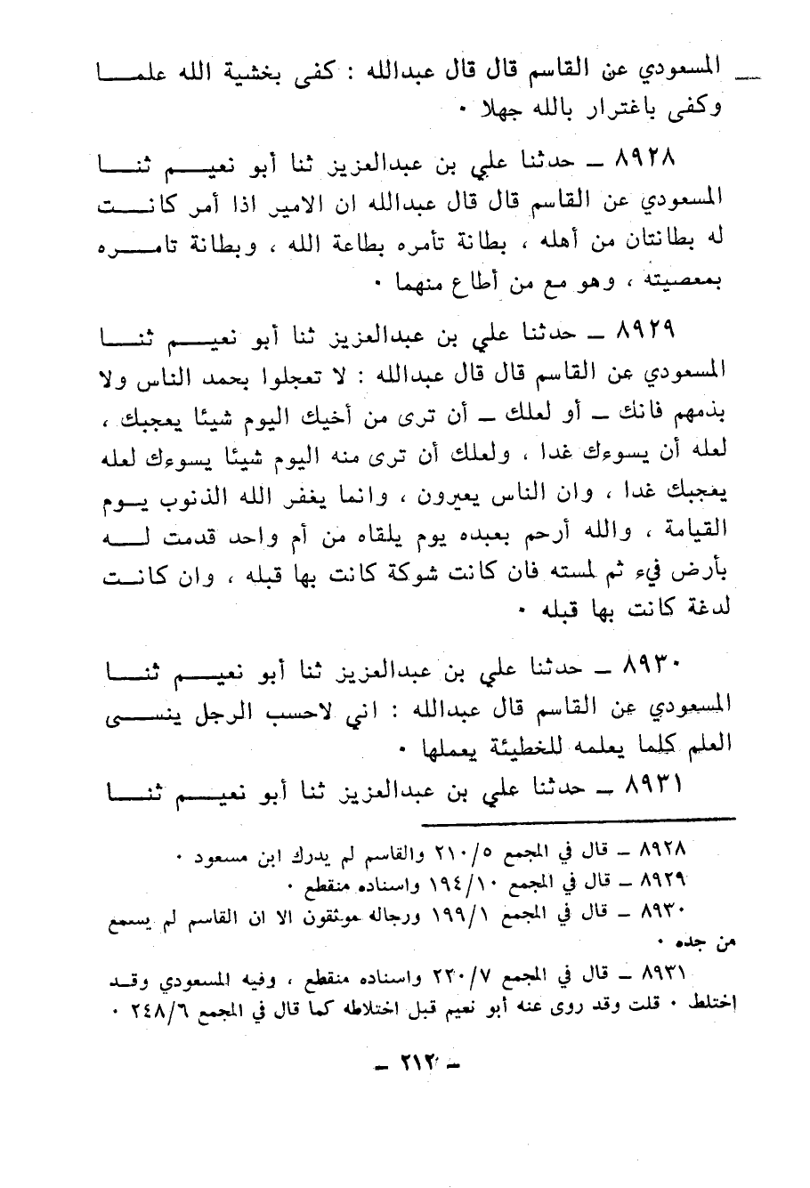 9033 - حَدَّثَنَا مُحَمَّدُ بْنُ عَلِيٍّ الصَّائِغُ، ثنا سَعِيدُ بْنُ مَنْصُورٍ، ثنا هُشَيْمٌ، أَنَا الْعَوَّامُ، عَنِ الشَّعْبِيِّ، عَنِ ابْنِ مَسْعُودٍ، قَالَ: «§حَبْلُ اللهِ عَزَّ وَجَلَّ هُوَ الْجَمَاعَةُ»