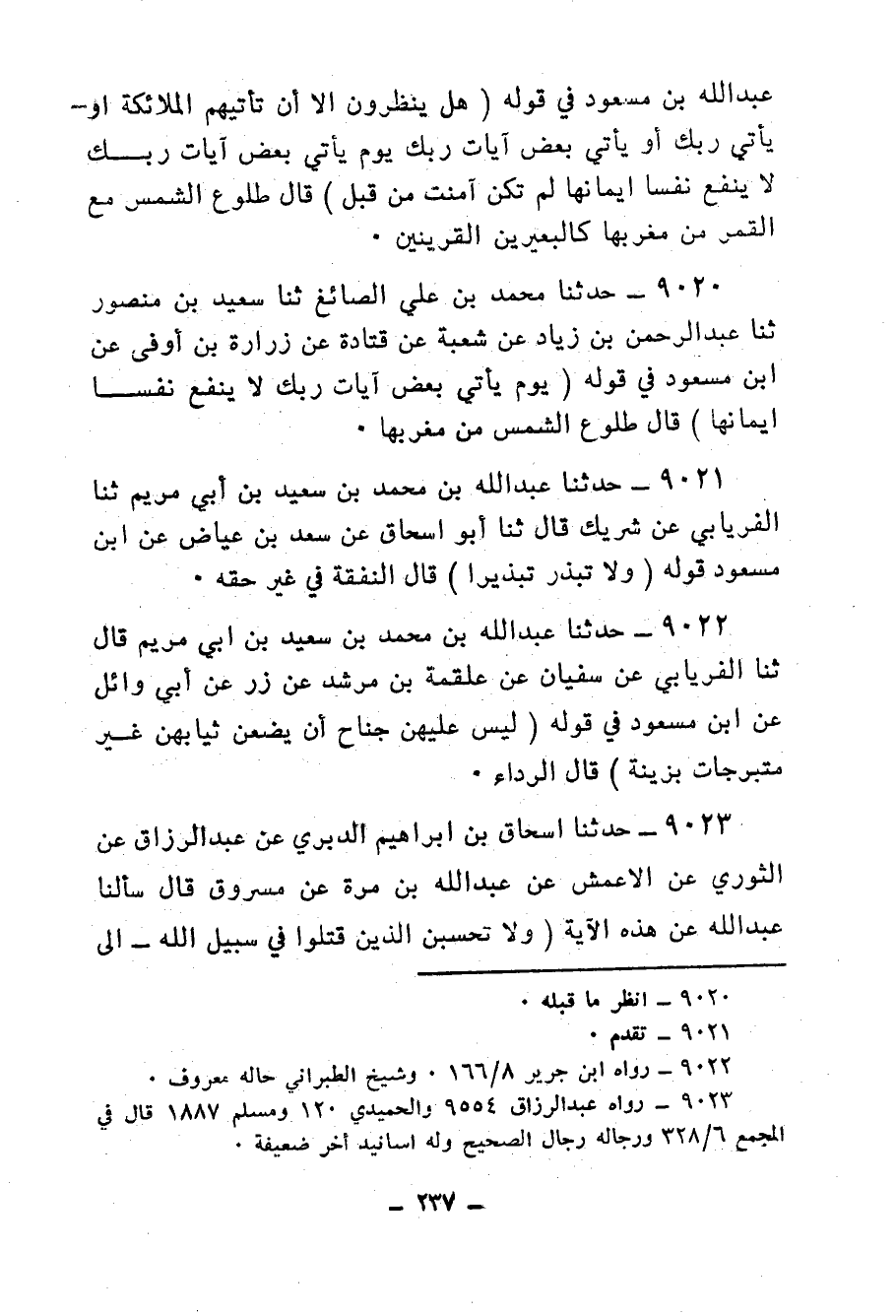 9160 - حَدَّثَنَا عُثْمَانُ بْنُ عُمَرَ الضَّبِّيُّ، ثنا عَبْدُ اللهِ بْنُ رَجَاءَ، أَنَا إِسْرَائِيلُ، عَنْ أَبِي إِسْحَاقَ، عَنْ عَبْدِ الرَّحْمَنِ بْنِ عَبْدِ اللهِ، أَوِ ابْنِ يَزِيدَ، عَنْ عَبْدِ اللهِ، قَالَ: «إِنَّ §الرَّجُلَ لَيَتَكَلَّمُ بِالْكَلِمَةِ يُضْحِكُ بِهَا جُلَسَاءَهُ مَا يَنْقَلِبُ إِلَى أَهْلِهِ مِنْهَا بِشَيْءٍ، نَزَلَ بِهَا أَبْعَدَ مِنَ السَّمَاءِ إِلَى الْأَرْضِ»