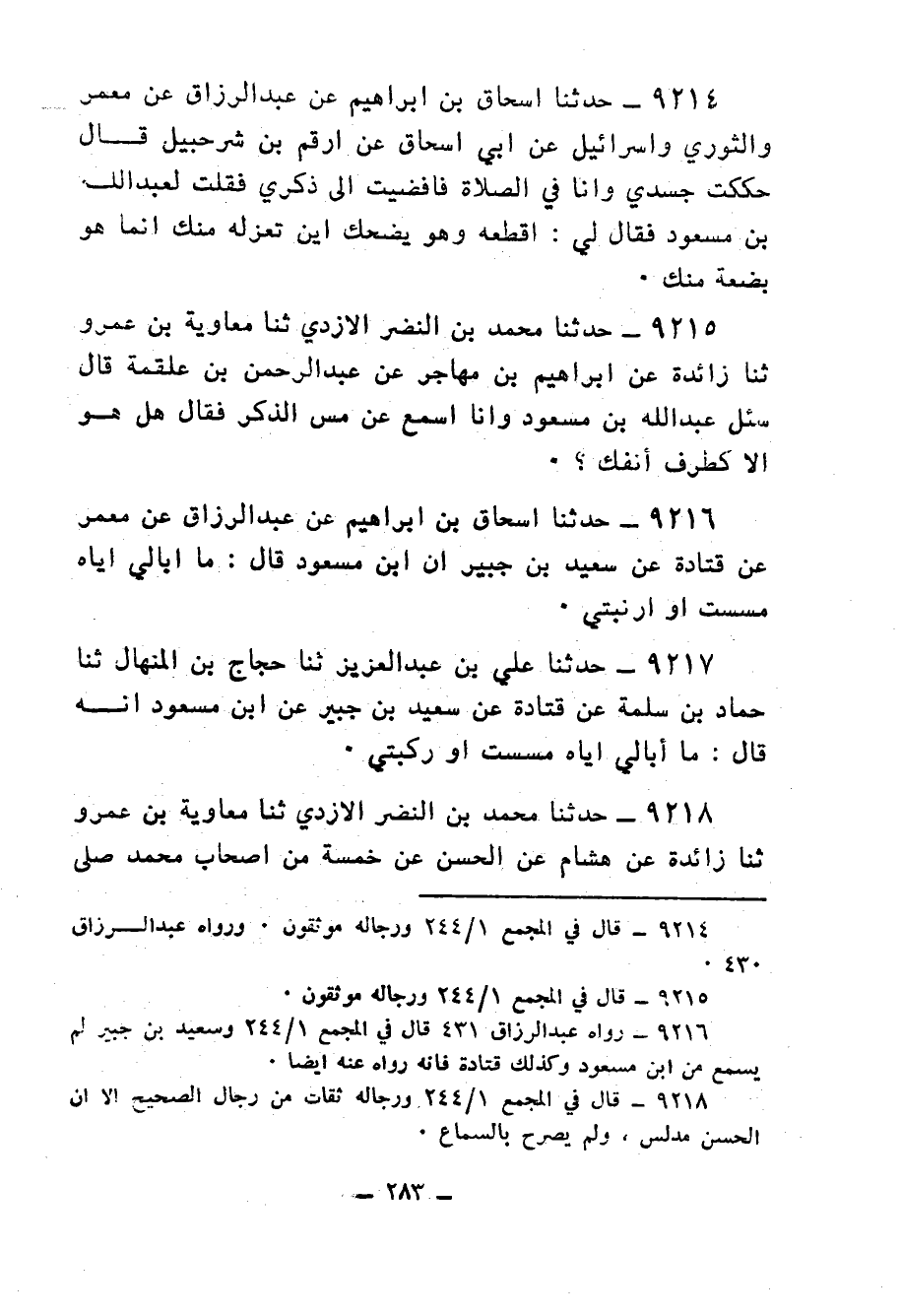9424 - حَدَّثَنَا إِسْحَاقُ بْنُ إِبْرَاهِيمَ، عَنْ عَبْدِ الرَّزَّاقِ، عَنْ إِسْمَاعِيلَ بْنِ عَبْدِ اللهِ، عَنِ ابْنِ عَوْنٍ، عَنِ ابْنِ سِيرِينَ، قَالَ: «سَمَرَ عَبْدُ اللهِ بْنُ مَسْعُودٍ، وَحُذَيْفَةُ بْنُ الْيَمَانِ عِنْدَ الْوَلِيدِ بْنِ عُقْبَةَ بْنِ أَبِي مُعَيْطٍ، ثُمَّ خَرَجَا مِنْ عِنْدِهِ فَقَامَا يَتَحَدَّثَانِ حَتَّى رَأَيَا تَبَاشِيرَ الْفَجْرِ» §فَأَوْتَرَ كُلُّ وَاحِدٍ مِنْهُمَا بِرَكْعَةٍ "