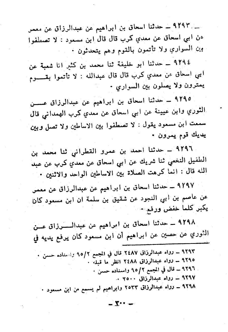 9503 - حَدَّثَنَا عَلِيُّ بْنُ عَبْدِ الْعَزِيزِ، ثنا أَبُو نُعَيْمٍ، ثنا شَرِيكٌ، عَنْ عَاصِمٍ، عَنِ الْمُسَيَّبِ بْنِ رَافِعٍ، عَنْ عَبْدِ اللهِ، قَالَ: " §أَرْبَعٌ مِنَ الْجَفَاءِ: أَنْ تَمْسَحَ وَجْهَكَ وَأَنْتَ فِي الصَّلَاةِ، وَأَنْ تُصَلِّيَ إِلَى غَيْرِ سُتْرَةٍ، وَأَنْ تَبُولَ قَائِمًا، وَأَنْ تَسْمَعَ الْمُؤَذِّنَ وَلَا تَقُولُ كَمَا يَقُولُ "