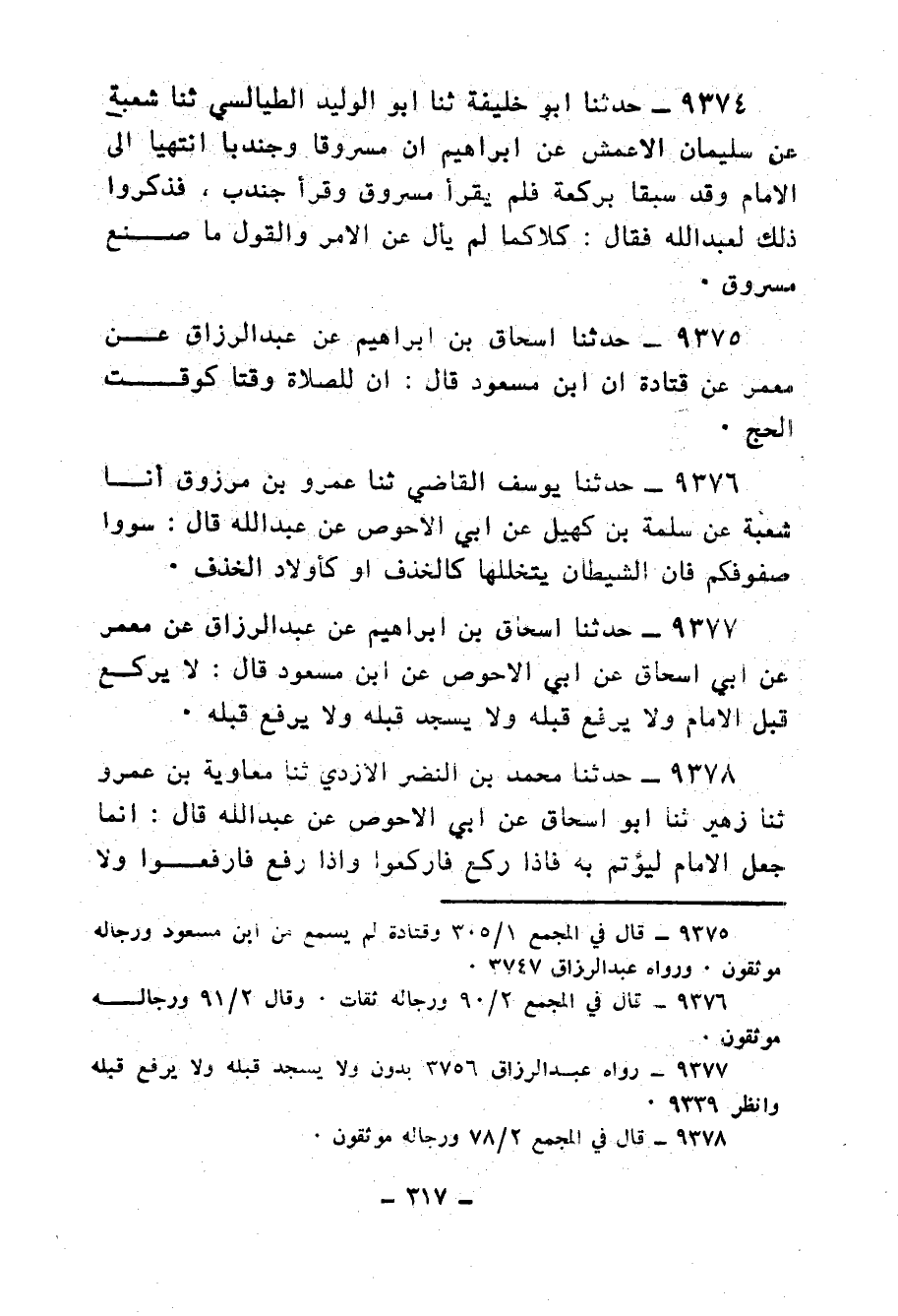 9588 - حَدَّثَنَا إِسْحَاقُ بْنُ إِبْرَاهِيمَ، عَنْ عَبْدِ الرَّزَّاقِ، عَنِ الثَّوْرِيِّ، عَنِ الْأَعْمَشِ، عَنْ زَيْدِ بْنِ وَهْبٍ، قَالَ: «كَانَ عَبْدُ اللهِ، §يُصَلِّي بِنَا فِي شَهْرِ رَمَضَانَ فَيَنْصَرِفُ بِلَيْلٍ»