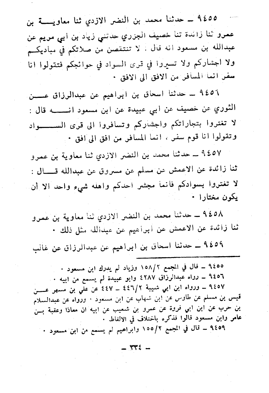 9658 - حَدَّثَنَا إِسْحَاقُ بْنُ إِبْرَاهِيمَ، عَنْ عَبْدِ الرَّزَّاقِ، عَنِ الثَّوْرِيِّ، عَنْ مَنْصُورٍ، عَنْ إِبْرَاهِيمَ، عَنْ عَلْقَمَةَ، قَالَ: سَأَلَ ابْنَ مَسْعُودٍ نِسَاءٌ مِنْ هَمْدَانَ نُعِيَ إِلَيْهِنَّ أَزْوَاجَهُنَّ، فَقُلْنَ: إِنَّا نَسْتَوْحِشُ، فَقَالَ عَبْدُ اللهِ: «§تَجْتَمِعْنَ بِالنَّهَارِ ثُمَّ تَرْجِعُ كُلُّ وَاحِدَةٍ مِنْهُنَّ إِلَى بَيْتِهَا بِاللَّيْلِ»