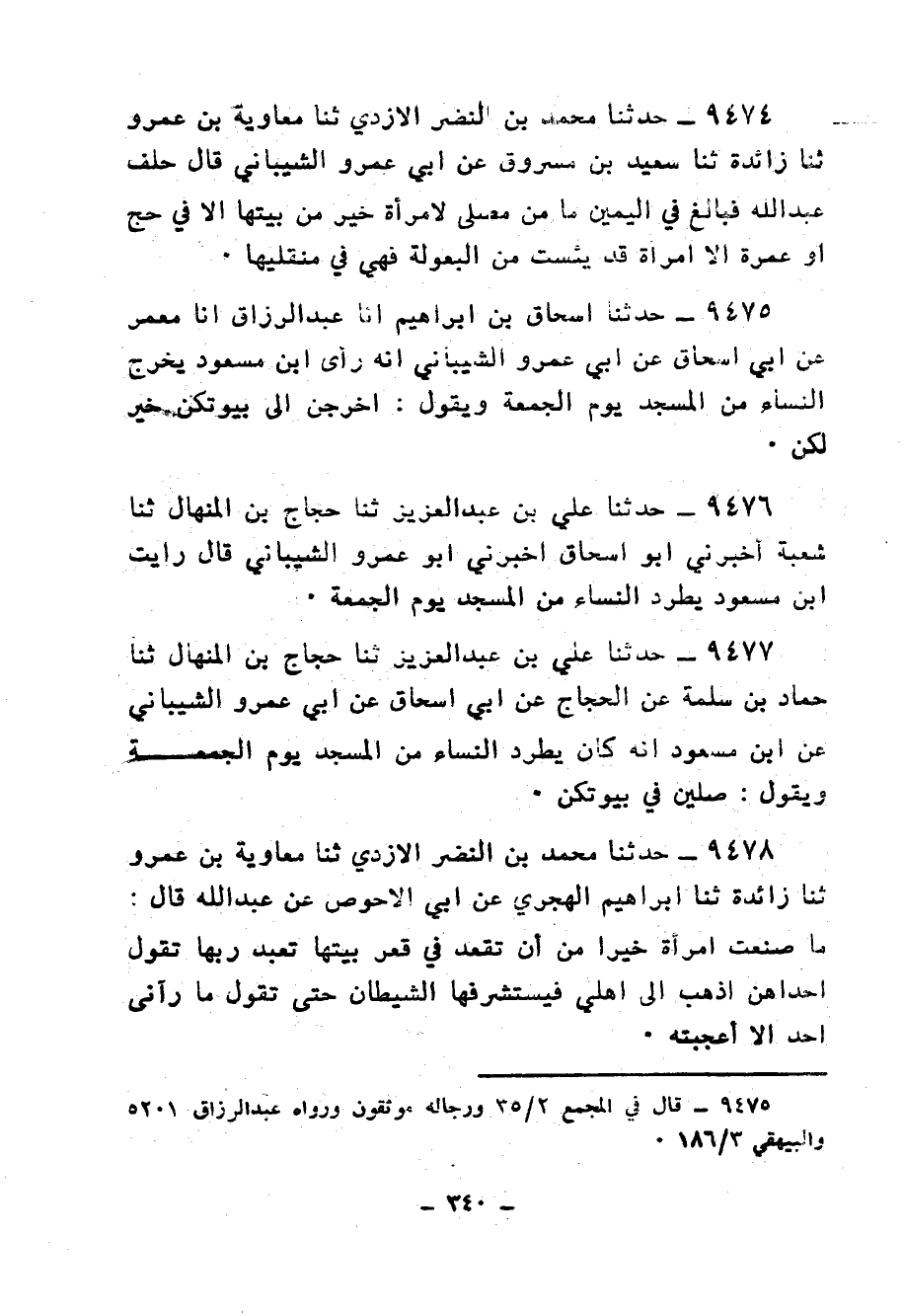 9692 - حَدَّثَنَا مُحَمَّدُ بْنُ عَلِيٍّ الصَّائِغُ، ثنا سَعِيدُ بْنُ مَنْصُورٍ، ثنا سُفْيَانُ، عَنْ مَنْصُورٍ، عَنْ إِبْرَاهِيمَ، عَنْ هَمَّامِ بْنِ الْحَارِثِ، عَنْ عَمْرِو بْنِ شُرَحْبِيلَ، أَنَّ مَعْقِلَ بْنَ مُقَرِّنٍ أَتَى عَبْدَ اللهِ، فَقَالَ: إِنَّهُ حَرَّمَ الْفِرَاشَ، فَقَالَ عَبْدُ اللهِ: " {§يَا أَيُّهَا الَّذِينَ آمَنُوا لَا تُحَرِّمُوا طَيِّبَاتِ مَا أَحَلَّ اللهُ لَكُمْ} [المائدة: 87] أَعْتِقْ رَقَبَةً "
