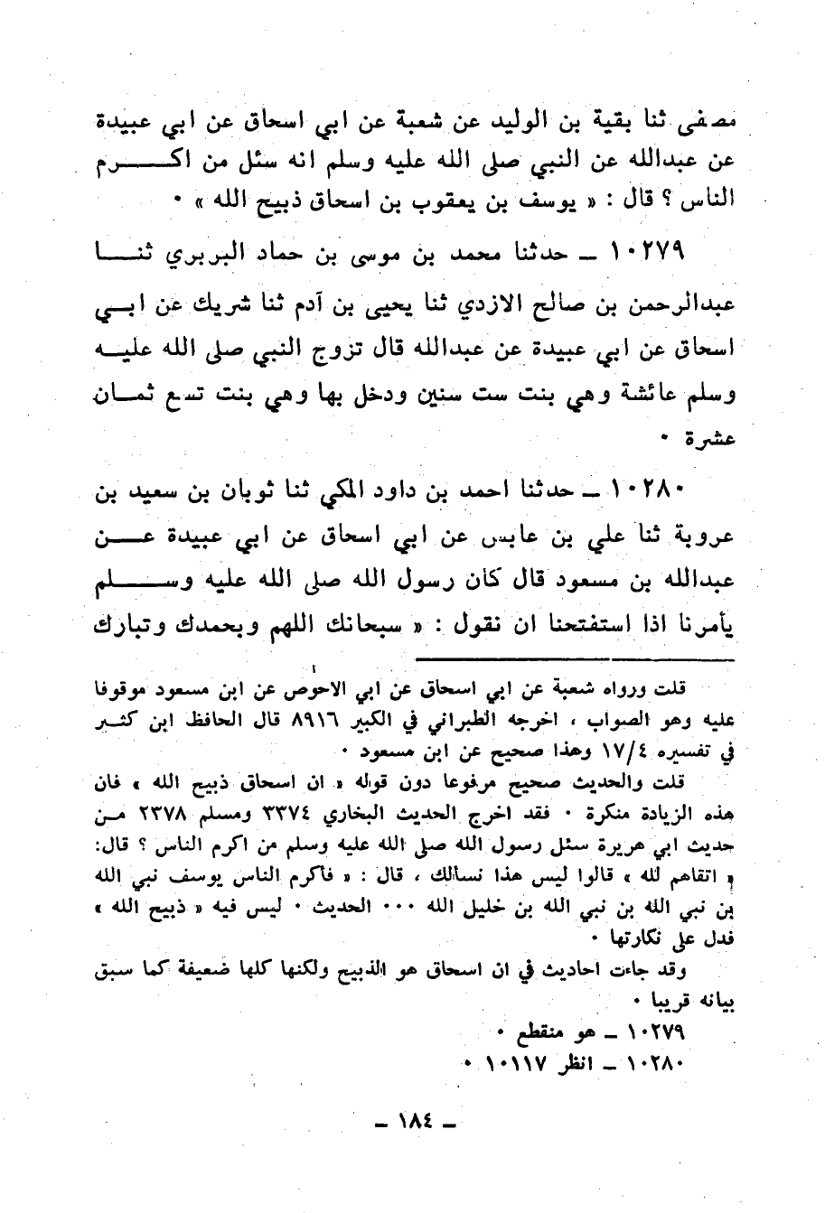 10400 - حَدَّثَنَا يَحْيَى بْنُ عُثْمَانَ بْنِ صَالِحٍ، ثنا أَصْبَغُ بْنُ الْفَرَجِ، ثنا عَلِيُّ بْنُ عَابِسٍ، عَنْ إِسْمَاعِيلَ بْنِ أَبِي خَالِدٍ، عَنْ قَيْسِ بْنِ أَبِي حَازِمٍ، عَنْ عَبْدِ اللهِ بْنِ مَسْعُودٍ قَالَ: كَانَ عَلَى عَائِشَةَ مُحَرَّرٌ مِنْ وَلَدِ إِسْمَاعِيلَ، فَقَدِمَ سَبْيٌ بَلْعَنْبَرَ، فَأَمَرَهَا النَّبِيُّ صَلَّى اللهُ عَلَيْهِ وَسَلَّمَ أَنْ تُعْتِقَ مِنْهُمْ وَقَالَ: «§مَنْ كَانَ عَلَيْهِ مُحَرَّرٌ مِنْ وَلَدِ إِسْمَاعِيلَ فَلَا يُعْتِقْ مِنْ حِمْيَرَ أَحَدًا» ، قَالَ عَلِيُّ بْنُ عَابِسٍ: فَقُلْتُ لِإِسْمَاعِيلَ بْنِ أَبِي خَالِدٍ: مَا كَانَ حِمْيَرُ؟ قَالَ: هُوَ أَكْبَرُ مِنْ إِسْمَاعِيلَ