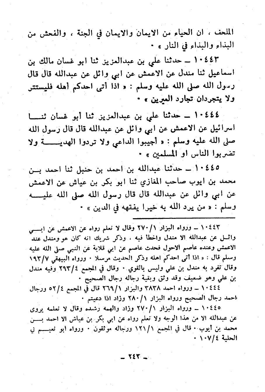 10443- حَدَّثَنَا عَلِيُّ بْنُ عَبْدِ الْعَزِيزِ ، حَدَّثَنَا أَبُو غَسَّانَ مَالِكُ بْنُ إِسْمَاعِيلَ ، حَدَّثَنَا مَنْدَلٌ ، عَنِ الأَعْمَشِ ، عَنْ أَبِي وَائِلٍ ، عَنْ عَبْدِ اللهِ ، قَالَ : قَالَ رَسُولُ اللهِ صَلَّى اللَّهُ عَلَيْهِ وَسَلَّمَ : إِذَا أَتَى أَحَدُكُمْ أَهْلَهُ فَلْيَسْتَتِرْ ، وَلاَ يَتَجَرَّدَانِ تَجَارُدَ الْعَيْرَيْنِ.