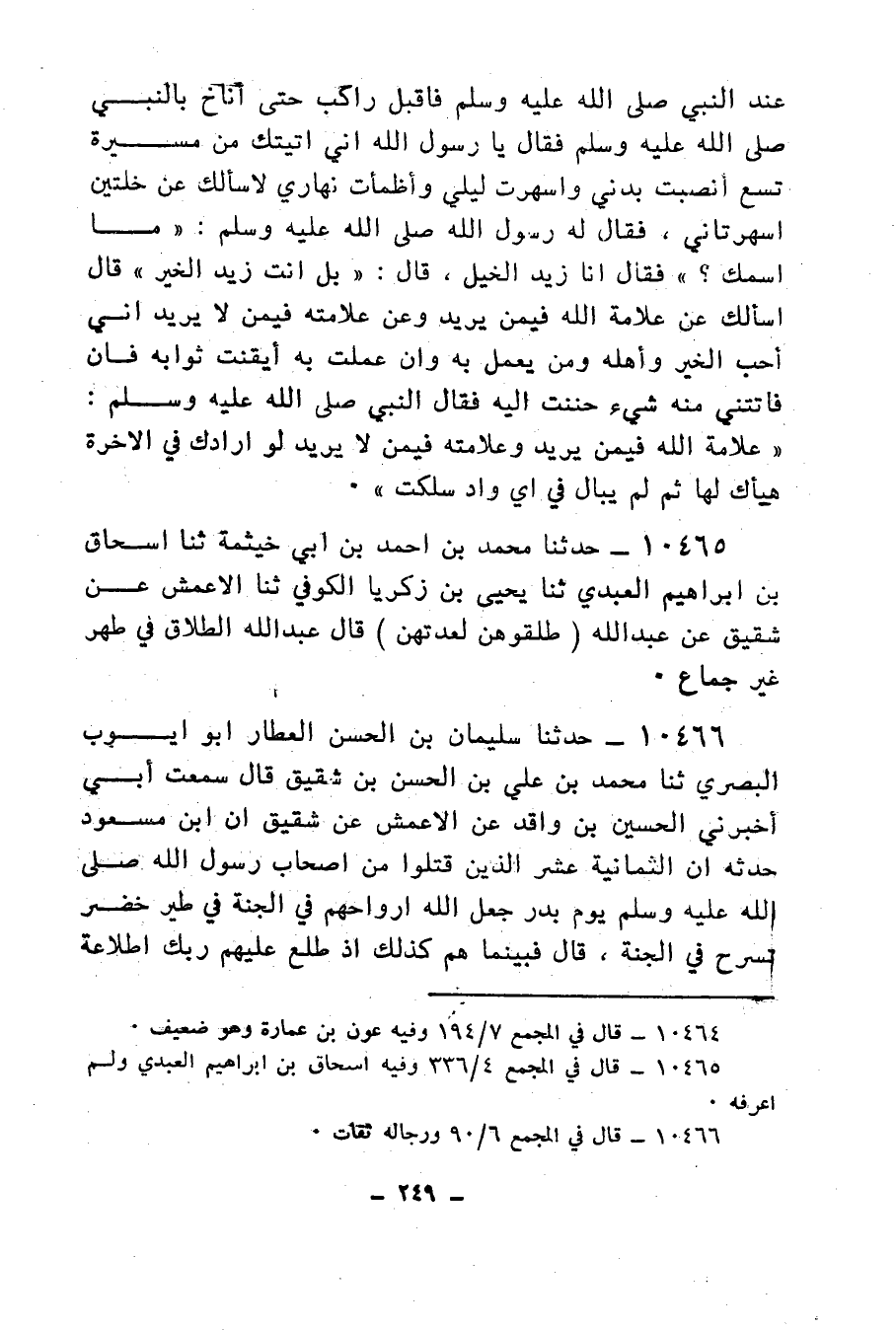 10464- حَدَّثَنَا مُحَمَّدُ بْنُ أَحْمَدَ بْنِ أَبِي خَيْثَمَةَ ، حَدَّثَنَا عَبْدُ اللهِ بْنُ عَبْدِ الْمُؤْمِنِ الْوَاسِطِيُّ ، حَدَّثَنَا عَوْنُ بْنُ عُمَارَةَ ، حَدَّثَنَا بِشْرٌ مَوْلَى بَنِي هَاشِمٍ ، عَنْ سُلَيْمَانَ الأَعْمَشِ ، عَنْ أَبِي وَائِلٍ ، عَنْ عَبْدِ اللهِ بْنِ مَسْعُودٍ قَالَ : كُنَّا عِنْدَ النَّبِيِّ صَلَّى اللَّهُ عَلَيْهِ وَسَلَّمَ ، فَأَقْبَلَ رَاكِبٌ حَتَّى أَنَاخَ بِالنَّبِيِّ صَلَّى اللَّهُ عَلَيْهِ وَسَلَّمَ ، فَقَالَ : يَا رَسُولَ اللهِ ، إِنِّي أَتَيْتُكَ مِنْ مَسِيرَةِ تِسْعٍ ، أَنْصَبْتُ بَدَنِي ، وَأَسْهَرْتُ لِيَلِي ، وَأَظْمَأْتُ نَهَارِي ؛ لأَسْأَلَكَ عَنْ خَلَّتَيْنِ أَسْهَرَتَانِي ، فَقَالَ لَهُ رَسُولُ اللهِ صَلَّى اللَّهُ عَلَيْهِ وَسَلَّمَ : مَا اسْمُكَ ؟ فَقَالَ : أَنَا زَيْدُ الْخَيْلِ ، قَالَ : بَلْ أَنْتَ زَيْدُ الْخَيْرِ ، قَالَ : أَسْأَلُكَ عَنْ عَلاَمَةِ اللهِ فِيمَنْ يُرِيدُ ، وَعَنْ عَلاَمَتِهِ فِيمَنْ لاَ يُرِيدُ ، إِنِّي أُحِبُّ الْخَيْرَ وَأَهْلَهُ وَمَنْ يَعْمَلُ بِهِ ، وَإِنْ عَمِلْتُ بِهِ أَيْقَنْتُ ثَوَابَهُ ، فَإِنْ فَاتَنِي مِنْهُ شَيْءٌ حَنَنْتُ إِلَيْهِ ، فَقَالَ النَّبِيُّ صَلَّى اللَّهُ عَلَيْهِ وَسَلَّمَ : عَلاَمَةُ اللهِ فِيمَنْ يُرِيدُ ، وَعَلاَمَتُهُ فِيمَنْ لاَ يُرِيدُ ، لَوْ أَرَادَكَ فِي الأُخْرَى هَيَّأَكَ لَهَا ، ثُمَّ لَمْ يُبَالِ فِي أَيِّ وَادٍ سَلَكْتَ.