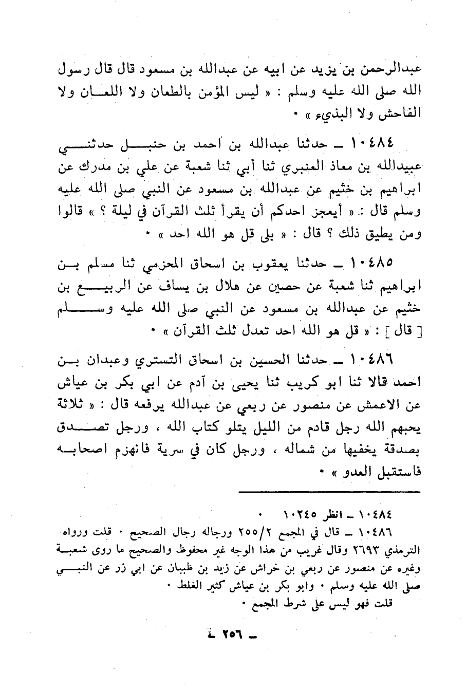 10485- حَدَّثَنَا يَعْقُوبُ بْنُ إِسْحَاقَ الْمُخَرِّمِيُّ ، حَدَّثَنَا مُسْلِمُ بْنُ إِبْرَاهِيمَ ، حَدَّثَنَا شُعْبَةُ ، عَنْ حُصَيْنٍ ، عَنْ هِلاَلِ بْنِ يَسَافٍ ، عَنِ الرَّبِيعِ بْنِ خُثَيْمٍ ، عَنْ عَبْدِ اللهِ بْنِ مَسْعُودٍ ، عَنِ النَّبِيِّ صَلَّى اللَّهُ عَلَيْهِ وَسَلَّمَ قَالَ : {قُلْ هُوَ اللَّهُ أَحَدٌ} تَعْدِلُ ثُلُثَ الْقُرْآنِ.