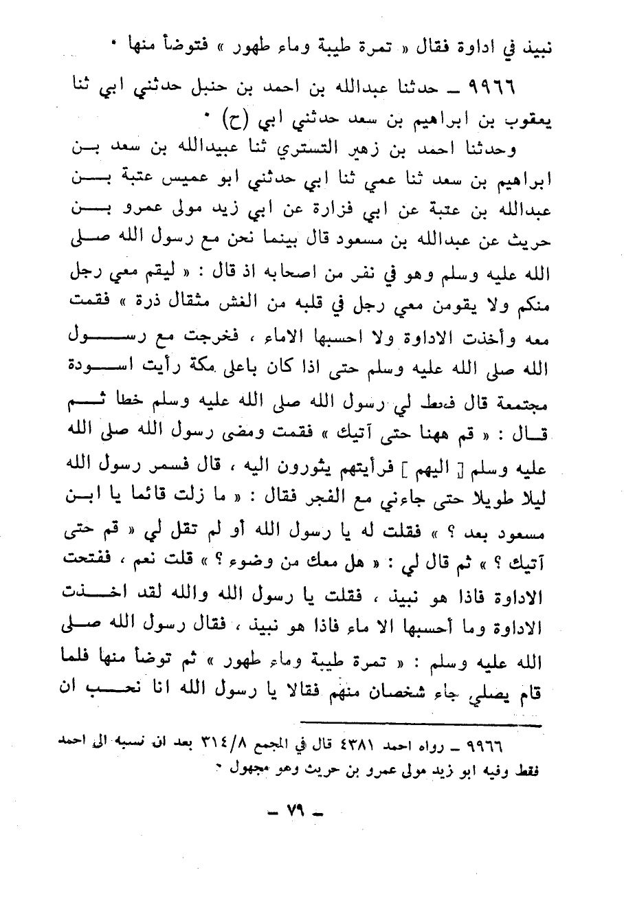 10016 - حَدَّثَنَا سَلَمَةُ بْنُ إِبْرَاهِيمَ بْنِ إِسْمَاعِيلَ بْنِ يَحْيَى بْنِ سَلَمَةَ بْنِ كُهَيْلٍ، حَدَّثَنِي أَبِي، عَنْ أَبِيهِ، عَنْ جَدِّهِ، عَنْ سَلَمَةَ بْنِ كُهَيْلٍ، عَنْ إِبْرَاهِيمَ، عَنْ عَلْقَمَةَ، عَنْ عَبْدِ اللهِ بْنِ مَسْعُودٍ قَالَ: كُنَّا مَعَ النَّبِيِّ صَلَّى اللهُ عَلَيْهِ وَسَلَّمَ فِي غَزْوَةِ خَيْبَرَ، فَأَرَادَ أَنْ يَتَبَرَّزَ، وَكَانَ إِذَا أَرَادَ ذَلِكَ تَبَاعَدَ حَتَّى لَا يَرَاهُ أَحَدٌ، فَقَالَ: «انْظُرْ يَا عَبْدَ اللهِ هَلْ تَرَى شَيْئًا؟» فَنَظَرْتُ فَرَأَيْتُ شَجَرَةً وَاحِدَةً، فَأَخْبَرْتُهُ، فَقَالَ لِي: «انْظُرْ هَلْ تَرَى شَيْئًا؟» فَنَظَرْتُ فَرَأَيْتُ شَجَرَةً أُخْرَى مُتَبَاعِدَةً مِنْ صَاحِبَتِهَا، فَأَخْبَرْتُهُ، فَقَالَ: " §قُلْ لَهُمَا: إِنَّ رَسُولَ اللهِ صَلَّى اللهُ عَلَيْهِ وَسَلَّمَ أَمَرَكُمَا أَنْ تَجْتَمِعَا "، فَقُلْتُ لَهُمَا ذَلِكَ، فَاجْتَمَعَا، ثُمَّ أَتَاهُمَا فَاسْتَتَرَ بِهِمَا، ثُمَّ قَامَ فَانْطَلَقَتْ كُلُّ وَاحِدَةٍ مِنْهُمَا إِلَى مَكَانِهَا