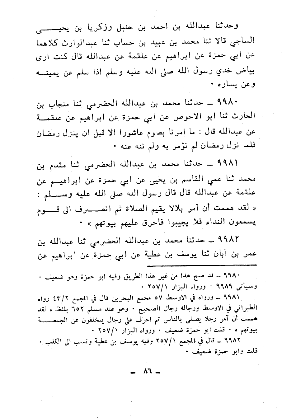 10035 - حَدَّثَنَا مُحَمَّدُ بْنُ عَبْدِ اللهِ الْحَضْرَمِيُّ، ثنا مُحَمَّدُ بْنُ عُبَيْدٍ الْمُحَارِبِيُّ، ثنا أَبُو حَفْصٍ الْأَسَدِيُّ، عَنْ يَاسِينَ الزَّيَّاتِ، عَنْ إِبْرَاهِيمَ، عَنْ عَلْقَمَةَ، عَنْ عَبْدِ اللهِ، عَنِ النَّبِيِّ صَلَّى اللهُ عَلَيْهِ وَسَلَّمَ مِثْلَهُ