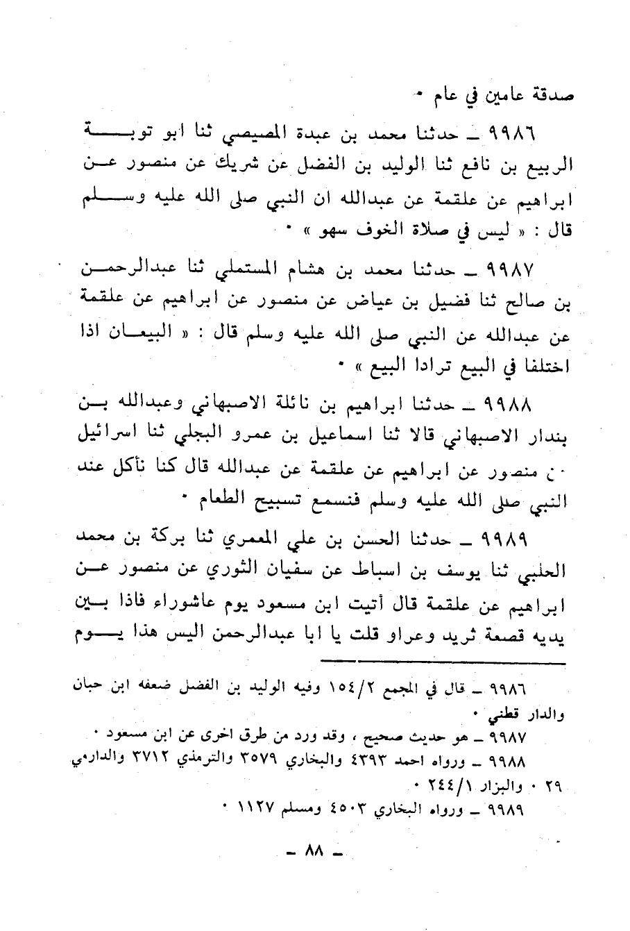 10043 - حَدَّثَنَا جَعْفَرُ بْنُ مُحَمَّدٍ الْفِرْيَابِيُّ، ثنا عَبْدُ الرَّحْمَنِ بْنُ عَمْرٍو الْحَرَّانِيُّ، ثنا مُحَمَّدُ بْنُ فُضَيْلٍ قَالَ: قَالَ لِي مُغِيرَةُ: سَمِعْتُ مِنْ عُمَارَةَ بْنِ الْقَعْقَاعِ شَيْئًا ذَكَرَهُ عَنْ إِبْرَاهِيمَ، وَكَانَ عُمَارَةُ قَدْ خَرَجَ إِلَى مَكَّةِ، فَاكْتَرَيْتُ حِمَارًا فَأَتَيْتُهُ بِالْقَادِسِيَّةِ، فَحَدَّثَنِي عَنْ إِبْرَاهِيمَ، عَنْ عَلْقَمَةَ، عَنْ عَبْدِ اللهِ قَالَ: كَانَ رَسُولُ اللهِ صَلَّى اللهُ عَلَيْهِ وَسَلَّمَ يَمُرُّ بِهِ الْفِتْيَةُ مِنْ أَهْلِ بَيْتِهِ فَيَتَغَيَّرُ لِذَلِكَ لَوْنُهُ، فَمَرَّ بِهِ يَوْمًا فِتْيَةٌ مِنْ أَهْلِ بَيْتِهِ، فَتَغَيَّرَ لِذَلِكَ لَوْنُهُ، فَقُلْنَا: يَا رَسُولَ اللهِ، مَا نَزَالُ نَرَى مِنْكَ مَا يَشُقُّ عَلَيْنَا، الْفِتْيَةُ مِنْ أَهْلِ بَيْتِكَ يَمُرُّونَ بِكَ فَيَتَغَيَّرُ لِذَلِكَ لَوْنُكَ، فَقَالَ: «إِنَّ §أَهْلَ بَيْتِي هَؤُلَاءِ اخْتَارَ اللهُ لَهُمُ الْآخِرَةَ، وَلَمْ يَخْتَرْ لَهُمُ الدُّنْيَا»