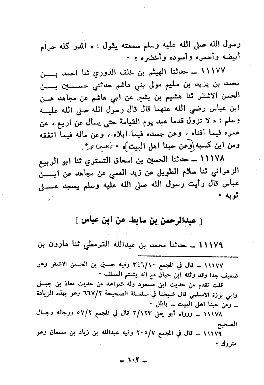 11177 - حَدَّثَنَا الْهَيْثَمُ بْنُ خَلَفٍ الدُّورِيُّ، ثنا أَحْمَدُ بْنُ مُحَمَّدِ بْنِ يَزِيدَ بْنِ سُلَيْمٍ، مَوْلَى بَنِي هَاشِمٍ، حَدَّثَنِي حُسَيْنُ بْنُ الْحَسَنِ الْأَشْقَرُ، ثنا هُشَيْمُ بْنُ بَشِيرٍ، عَنْ أَبِي هَاشِمٍ، عَنْ مُجَاهِدٍ، عَنِ ابْنِ عَبَّاسٍ رَضِي اللهُ عَنْهُمَا، قَالَ: قَالَ رَسُولُ اللهِ صَلَّى اللهُ عَلَيْهِ وَسَلَّمَ: " §لَا تَزُولُ قَدَمَا عَبْدٍ يَوْمَ الْقِيَامَةِ حَتَّى يُسْأَلَ عَنْ أَرْبَعٍ: عَنْ عُمْرِهِ فِيمَا أَفْنَاهُ، وَعَنْ جَسَدِهِ فِيمَا أَبْلَاهُ، وَعَنْ مَالِهِ فِيمَا أَنْفَقَهُ، وَمِنْ أَيْنَ كَسَبَهُ، وَعَنْ حُبِّنَا أَهْلَ الْبَيْتِ "