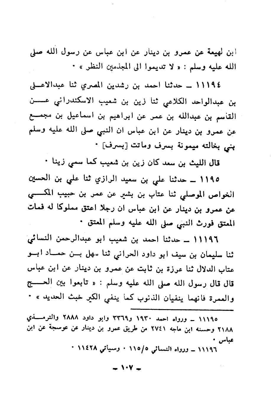 11196 - حَدَّثَنَا أَحْمَدُ بْنُ شُعَيْبٍ أَبُو عَبْدِ الرَّحْمَنِ النَّسَائِيُّ، ثنا سُلَيْمَانُ بْنُ سَيْفٍ أَبُو دَاوُدَ الْحَرَّانِيُّ، ثنا سَهْلُ بْنُ حَمَّادٍ أَبُو عَتَّابِ الدَّلَّالُ، ثنا عُزْرَةُ بْنُ ثَابِتٍ، عَنْ عَمْرِو بْنِ دِينَارٍ، عَنِ ابْنِ عَبَّاسٍ، قَالَ: قَالَ رَسُولُ اللهِ صَلَّى اللهُ عَلَيْهِ وَسَلَّمَ: «§تَابِعُوا بَيْنَ الْحَجِّ وَالْعُمْرَةِ، فَإِنَّهُمَا يَنْفِيَانِ الذُّنُوبَ كَمَا يَنْفِي الْكِيرُ خَبَثَ الْحَدِيدِ»