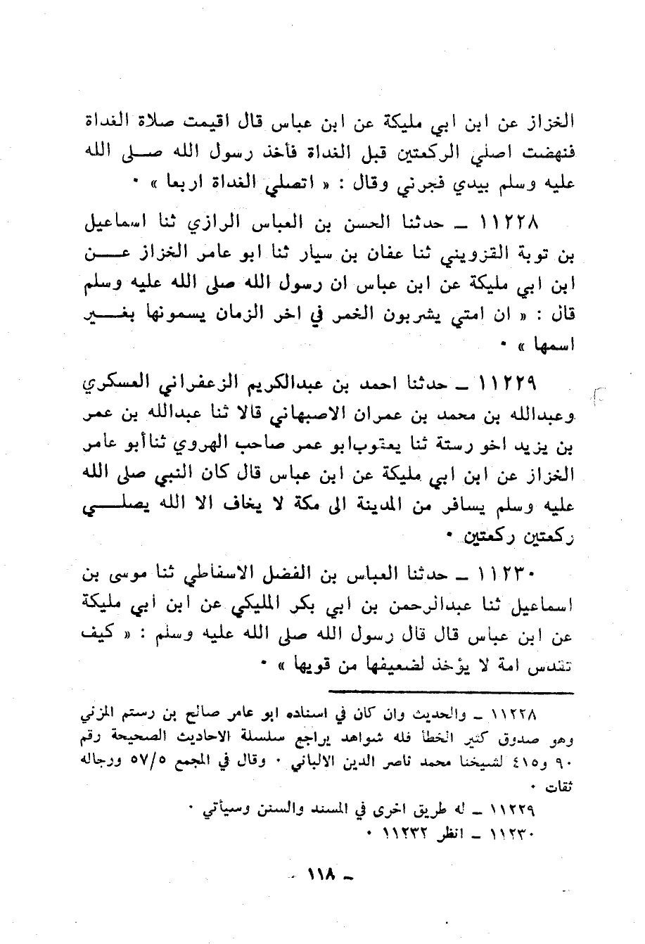 11228 - حَدَّثَنَا الْحَسَنُ بْنُ الْعَبَّاسِ الرَّازِيُّ، ثنا إِسْمَاعِيلُ بْنُ تَوْبَةَ الْقَزْوِينِيُّ، ثنا عَفَّانُ بْنُ سَيَّارٍ، ثنا أَبُو عَامِرٍ الْخَزَّارُ، عَنِ ابْنِ أَبِي مُلَيْكَةَ، عَنِ ابْنِ عَبَّاسٍ، أَنَّ رَسُولَ اللهِ صَلَّى اللهُ عَلَيْهِ وَسَلَّمَ قَالَ: «إِنَّ §أُمَّتِي يَشْرَبُونَ الْخَمْرَ فِي آخِرِ الزَّمَانِ يُسَمُّونَهَا بِغَيْرِ اسْمِهَا»