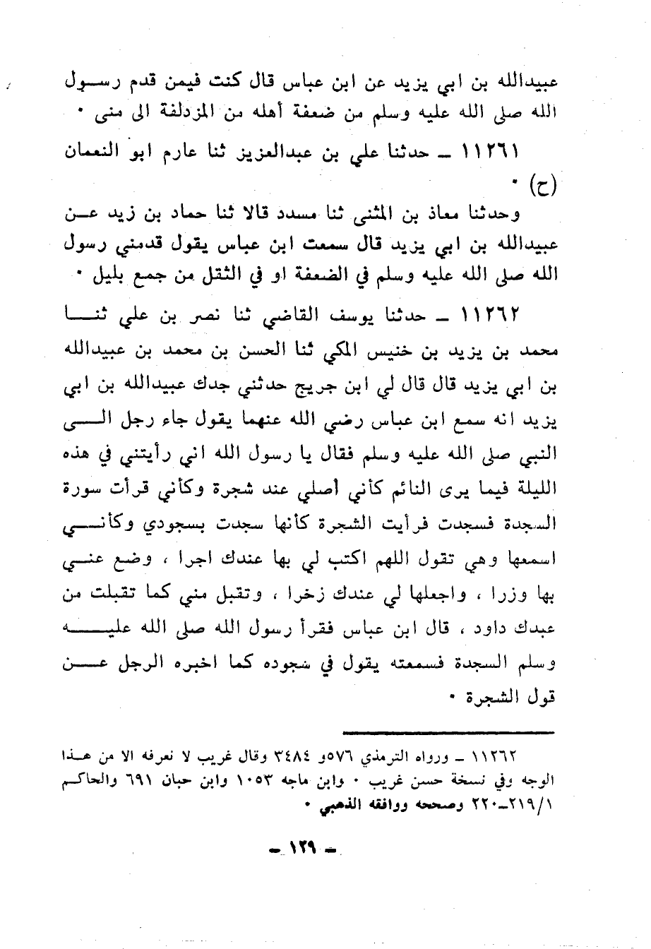 11262 - حَدَّثَنَا يُوسُفُ الْقَاضِي، ثنا نَصْرُ بْنُ عَلِيٍّ، ثنا مُحَمَّدُ بْنُ يَزِيدَ بْنِ خُنَيْسٍ الْمَكِّيُّ، ثنا الْحَسَنُ بْنُ مُحَمَّدِ بْنِ عُبَيْدِ اللهِ بْنِ أَبِي يَزِيدَ، قَالَ: قَالَ لِي ابْنُ جُرَيْجٍ، حَدَّثَنِي جَدُّكَ عُبَيْدُ اللهِ بْنُ أَبِي يَزِيدَ، أَنَّهُ سَمِعَ ابْنَ عَبَّاسٍ رَضِي اللهُ عَنْهُما، يَقُولُ: جَاءَ رَجُلٌ إِلَى النَّبِيِّ صَلَّى اللهُ عَلَيْهِ وَسَلَّمَ فَقَالَ: يَا رَسُولَ اللهِ، إِنِّي رَأَيْتُنِي فِي هَذِهِ اللَّيْلَةِ فِيمَا يَرَى النَّائِمُ، كَأَنِّي أُصَلِّي عِنْدَ شَجَرَةٍ، وَكَأَنِّي قَرَأْتُ سُورَةَ السَّجْدَةِ، فَسَجَدْتُ فَرَأَيْتُ الشَّجَرَةَ كَأَنَّهَا سَجَدَتْ بسُجُودِي، وَكَأَنِّي أَسْمَعُهَا وَهِي تَقُولُ: اللهُمَّ اكْتُبْ لِي بِهَا عِنْدَكَ أَجْرًا وَضَعْ عَنِّي بِهَا وِزْرًا وَاجْعَلْهَا لِي عِنْدَكَ ذُخْرًا وَتَقَبَّلْ مِنِّي كَمَا تَقَبَّلْتَ مِنْ عَبْدِكَ دَاوُدَ، قَالَ ابْنُ عَبَّاسٍ: «§فَقَرَأَ رَسُولُ اللهِ صَلَّى اللهُ عَلَيْهِ وَسَلَّمَ السَّجْدَةَ فَسَمِعْتُهُ يَقُولُ فِي سُجُودِهِ كَمَا أَخْبَرَهُ الرَّجُلُ عَنْ قَوْلِ الشَّجَرَةِ»