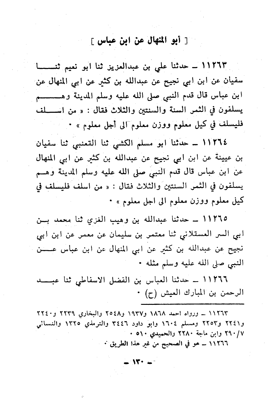 11264 - حَدَّثَنَا أَبُو مُسْلِمٍ الْكَشِّيُّ، ثنا الْقَعْنَبِيُّ، ثنا سُفْيَانُ بْنُ عُيَيْنَةَ، عَنِ ابْنِ أَبِي نَجِيحٍ، عَنْ عَبْدِ اللهِ بْنِ كَثِيرٍ، عَنْ أَبِي الْمِنْهَالِ، عَنِ ابْنِ عَبَّاسٍ، قَالَ: قَدِمَ النَّبِيُّ صَلَّى اللهُ عَلَيْهِ وَسَلَّمَ الْمَدِينَةَ وَهُمْ يُسْلِفُونَ فِي الثَّمَرِ السَّنَتَيْنِ وَالثَّلَاثَ فَقَالَ: «§مَنْ أَسْلَفَ فَلْيُسْلِفْ فِي كَيْلٍ مَعْلُومٍ وَوَزْنٍ مَعْلُومٍ إِلَى أَجْلٍ مَعْلُومٍ» .