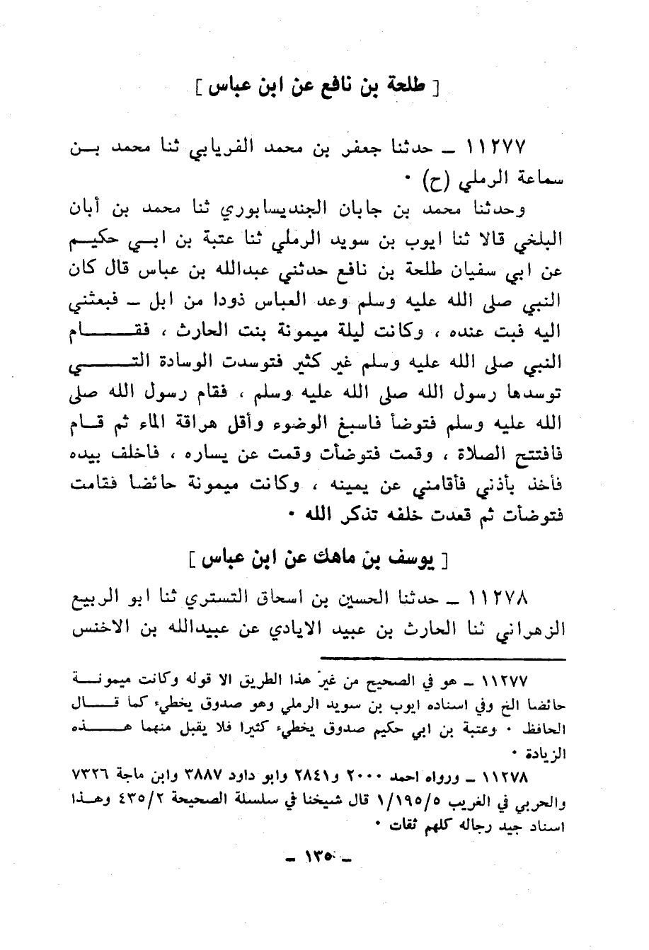 11277 - حَدَّثَنَا جَعْفَرُ بْنُ مُحَمَّدٍ الْفِرْيَابِيُّ، ثنا مُحَمَّدُ بْنُ سَمَاعَةَ الرَّمْلِيُّ، ح، وَحَدَّثَنَا مُحَمَّدُ بْنُ جَابَانَ الْجُنْدِيسَابُورِيُّ، ثنا مُحَمَّدُ بْنُ أَبَانَ الْبَلْخِيُّ، قَالَا: ثنا أَيُّوبُ بْنُ سُوَيْدٍ الرَّمْلِيُّ، ثنا عُتْبَةُ بْنُ أَبِي حَكِيمٍ، عَنْ أَبِي سُفْيَانَ طَلْحَةَ بْنِ نَافِعٍ، حَدَّثَنِي عَبْدُ اللهِ بْنُ عَبَّاسٍ، قَالَ: كَانَ النَّبِيُّ صَلَّى اللهُ عَلَيْهِ وَسَلَّمَ وَعَدَ الْعَبَّاسَ ذَوْدًا مِنْ إِبِلٍ فَبَعَثَنِي إِلَيْهِ فَبِتُّ عِنْدَهُ، وَكَانَتْ لَيْلَةَ مَيْمُونَةَ بِنْتِ الْحَارِثِ، فَقَامَ النَّبِيُّ صَلَّى اللهُ عَلَيْهِ وَسَلَّمَ غَيْرَ كَثِيرٍ فَتَوَسَّدْتُ الْوِسَادَةَ الَّتِي تَوَسَّدَها رَسُولُ اللهِ صَلَّى اللهُ عَلَيْهِ وَسَلَّمَ، فَقَامَ رَسُولُ اللهِ صَلَّى اللهُ عَلَيْهِ وَسَلَّمَ «§فَتَوَضَّأَ فَأَسْبَغَ الْوُضُوءَ، وَأَقَلَّ هِرَاقَةَ الْمَاءِ، ثُمَّ قَامَ فَافْتَتَحَ الصَّلَاةَ، وَقُمْتُ فَتَوَضَّأْتُ وَقُمْتُ عَنْ يَسَارِهِ، فَأَخْلَفَ بِيَدِهِ فَأَخَذَ بِأُذُنِي فَأَقَامَنِي عَنْ يَمِينِهِ» وَكَانَتْ مَيْمُونَةُ حَائِضًا فَقَامَتْ فَتَوَضَّأَتْ، ثُمَّ قَعَدَتْ خَلْفَهُ تَذْكُرُ اللهَ