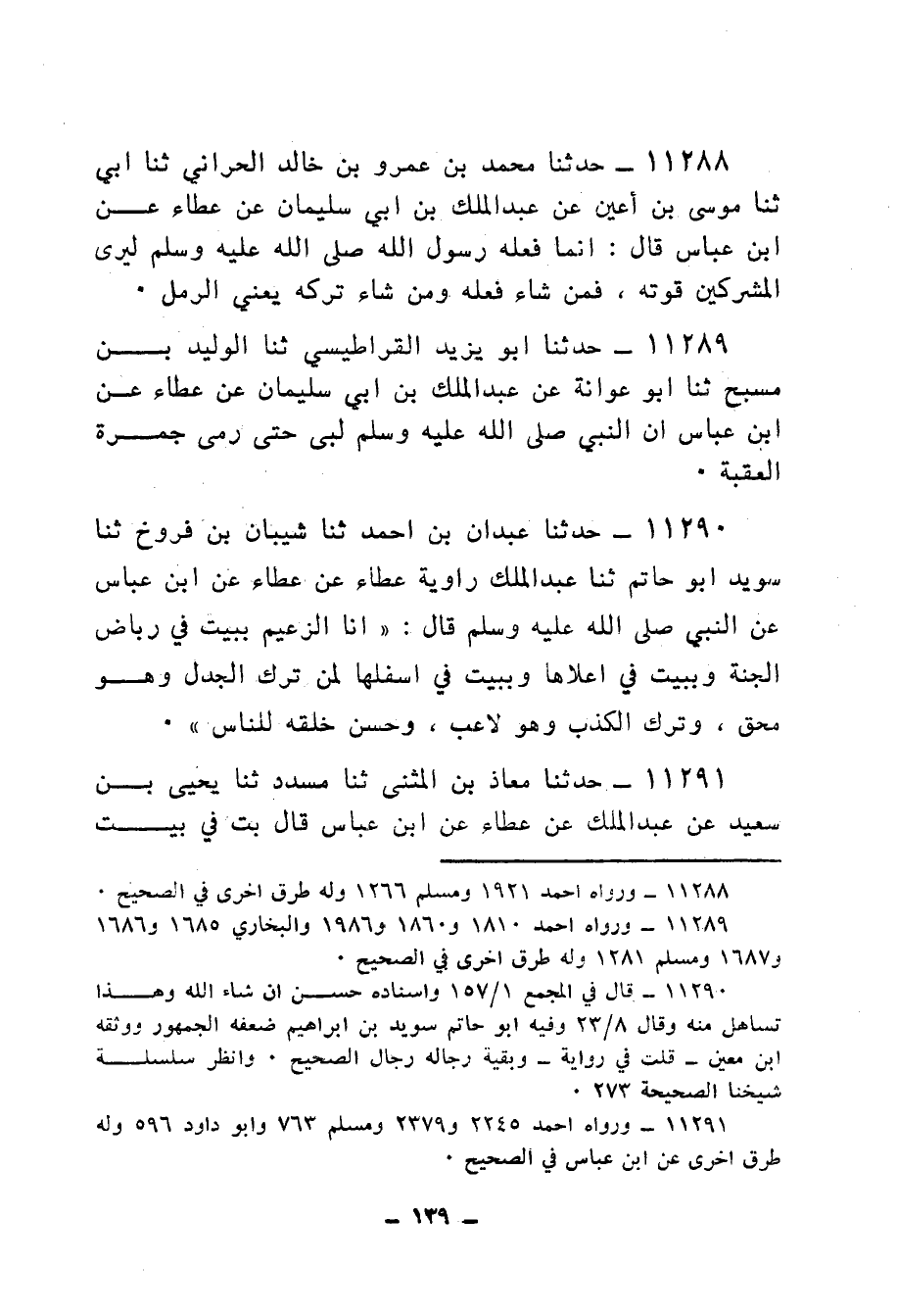 11289 - حَدَّثَنَا أَبُو يَزِيدَ الْقراطيسيُّ، ثنا الْوَلِيدُ بْنُ مسبحٍ، ثنا أَبُو عَوَانَةَ، عَنْ عَبْدِ الْمَلِكِ بْنِ أَبِي سُلَيْمَانَ، عَنْ عَطَاءٍ، عَنِ ابْنِ عَبَّاسٍ، أَنَّ النَّبِيَّ صَلَّى اللهُ عَلَيْهِ وَسَلَّمَ: «§لَبَّى حَتَّى رَمَى جَمْرَةَ الْعَقَبَةِ»