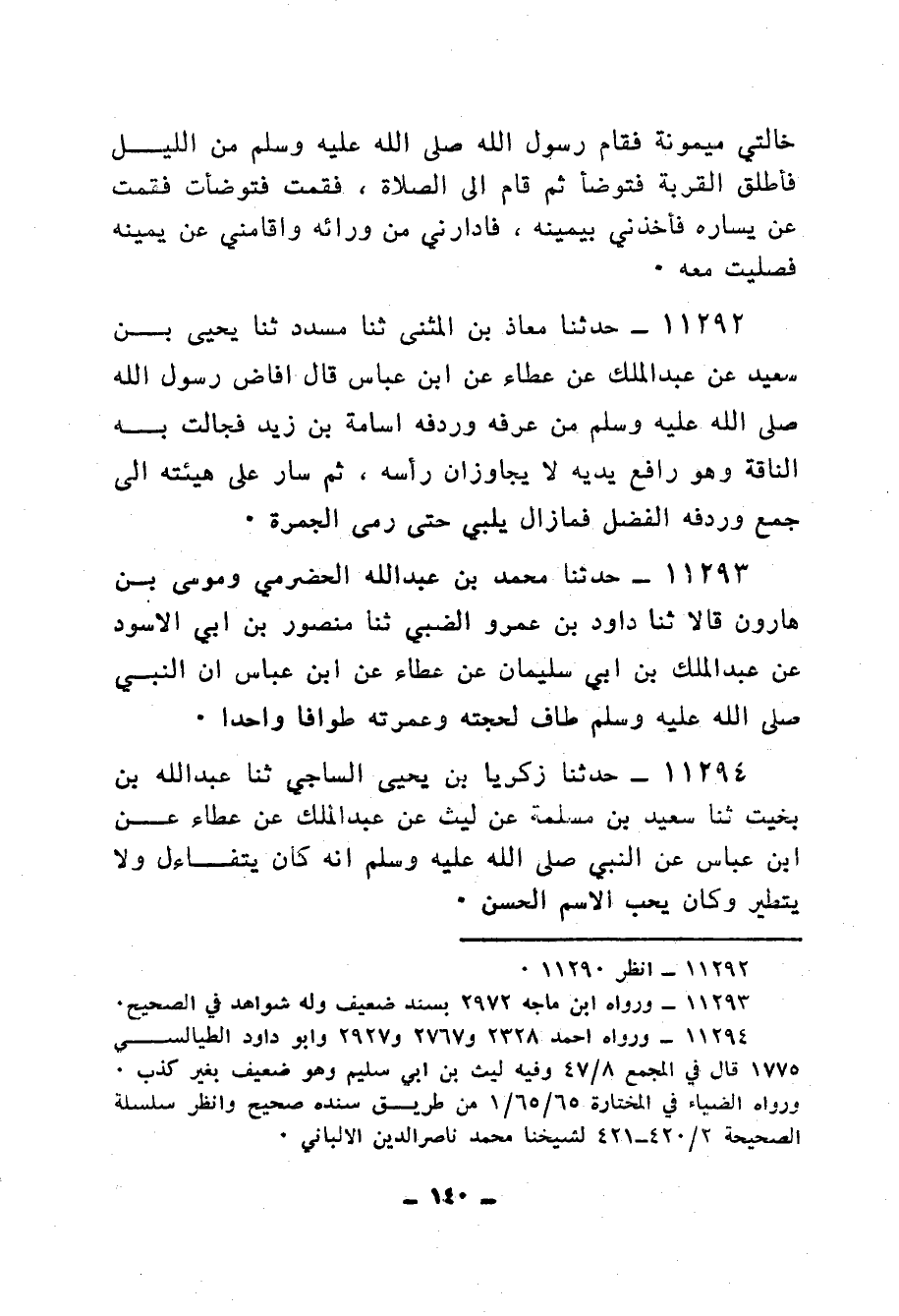 11292 - حَدَّثَنَا مُعَاذُ بْنُ الْمُثَنَّى، ثنا مُسَدَّدٌ، ثنا يَحْيَى بْنُ سَعِيدٍ، عَنْ عَبْدِ الْمَلِكِ، عَنْ عَطَاءٍ، عَنِ ابْنِ عَبَّاسٍ، قَالَ: «§أَفَاضَ رَسُولُ اللهِ صَلَّى اللهُ عَلَيْهِ وَسَلَّمَ مِنْ عَرَفَةَ وَرِدْفُهُ أُسَامَةُ بْنُ زَيْدٍ فَجَالَتْ بِهِ النَّاقَةُ وَهُوَ رَافِعٌ يَدَيْهِ لَا يُجَاوِزَانِ رَأْسَهُ، ثُمَّ سَارَ عَلَى هَيْئَتِهِ إِلَى جَمْعٍ وَرِدْفُهُ الْفَضْلُ فَمَا زَالَ يُلَبِّي حَتَّى رَمَى الْجَمْرَةَ»