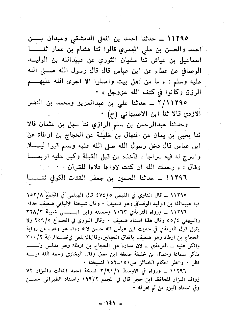 حَدَّثَنَا أَحْمَدُ بْنُ الْمُعَلَّى الدِّمَشْقِيُّ، وَعَبْدَانُ بْنُ أَحْمَدَ، وَالْحَسَنُ بْنُ عَلِيٍّ الْمَعْمَرِيُّ، قَالُوا: ثنا هِشَامُ بْنُ عَمَّارٍ، ثنا إِسْمَاعِيلُ بْنُ عَيَّاشٍ، ثنا سُفْيَانُ الثَّوْرِيُّ، عَنْ عُبَيْدِ اللهِ بْنِ الْوَلِيدِ الْوَصَّافِيِّ، عَنْ عَطَاءٍ، عَنِ ابْنِ عَبَّاسٍ، قَالَ: قَالَ رَسُولُ اللهِ صَلَّى اللهُ عَلَيْهِ وَسَلَّمَ: «§مَا مِنْ أَهْلِ بَيْتٍ وَاصَلُوا إِلَّا أَجْرَى الله عَلَيْهِمُ الرِّزْقَ، وَكَانُوا فِي كَنَفِ اللهِ عَزَّ وَجَلَّ»