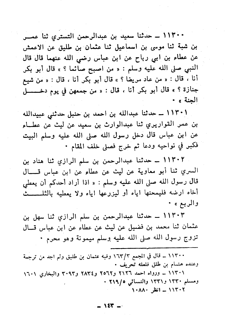 11300 - حَدَّثَنَا سَعِيدُ بْنُ عَبْدِ الرَّحْمَنِ التُّسْتَرِيُّ، ثنا عُمَرُ بْنُ شَبَّةَ، ثنا مُوسَى بْنُ إِسْمَاعِيلَ، ثنا عُثْمَانُ بْنُ طَلِيقٍ، عَنِ الْأَعْمَشِ، عَنْ عَطَاءِ بْنِ أَبِي رَبَاحٍ، عَنِ ابْنِ عَبَّاسٍ رَضِي اللهُ عَنْهُما، قَالَ: قَالَ النَّبِيُّ صَلَّى اللهُ عَلَيْهِ وَسَلَّمَ: «مَنْ أَصْبَحَ صَائِمًا؟» قَالَ أَبُو بَكْرٍ: أَنَا، قَالَ: «مَنْ عَادَ مَرِيضًا؟» قَالَ أَبُو بَكْرٍ: أَنَا قَالَ: «مَنْ شَيَّعَ جَنَازَةً؟» قَالَ أَبُو بَكْرٍ: أَنَا قَالَ: «§مَنْ جَمَعَهُنَّ فِي يَوْمٍ دَخَلَ الْجَنَّةَ»