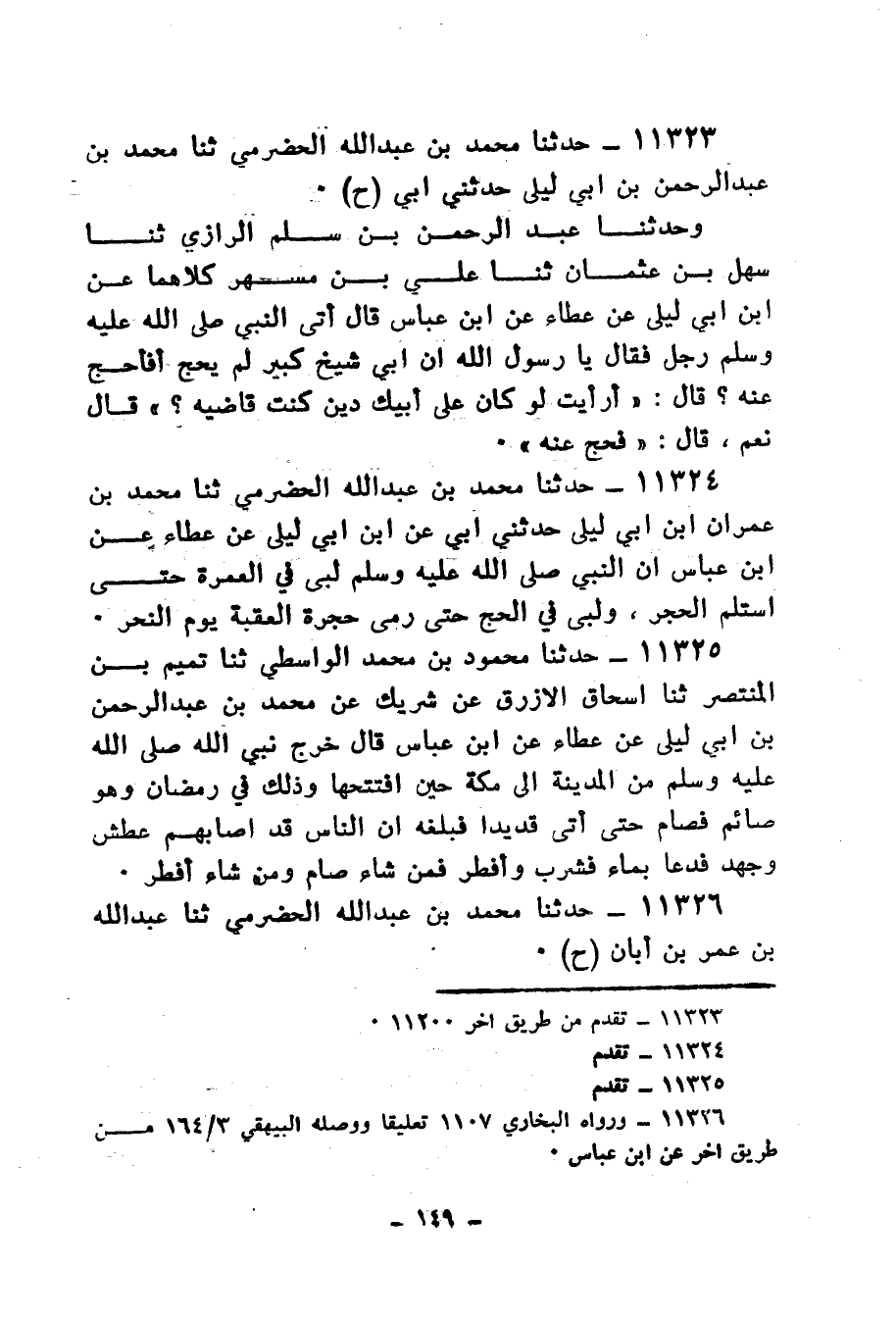 11324 - حَدَّثَنَا مُحَمَّدُ بْنُ عَبْدِ اللهِ الْحَضْرَمِيُّ، ثنا مُحَمَّدُ بْنُ عِمْرَانَ بْنِ أَبِي لَيْلَى، حَدَّثَنِي أَبِي، عَنِ ابْنِ أَبِي لَيْلَى، عَنْ عَطَاءٍ، عَنِ ابْنِ عَبَّاسٍ، أَنَّ النَّبِيَّ صَلَّى اللهُ عَلَيْهِ وَسَلَّمَ: «§لَبَّى فِي الْعُمْرَةِ حَتَّى اسْتَلَمَ الْحَجَرَ، وَلَبَّى فِي الْحَجِّ حَتَّى رَمَى جَمْرَةَ الْعَقَبَةِ يَوْمَ النَّحْرِ»