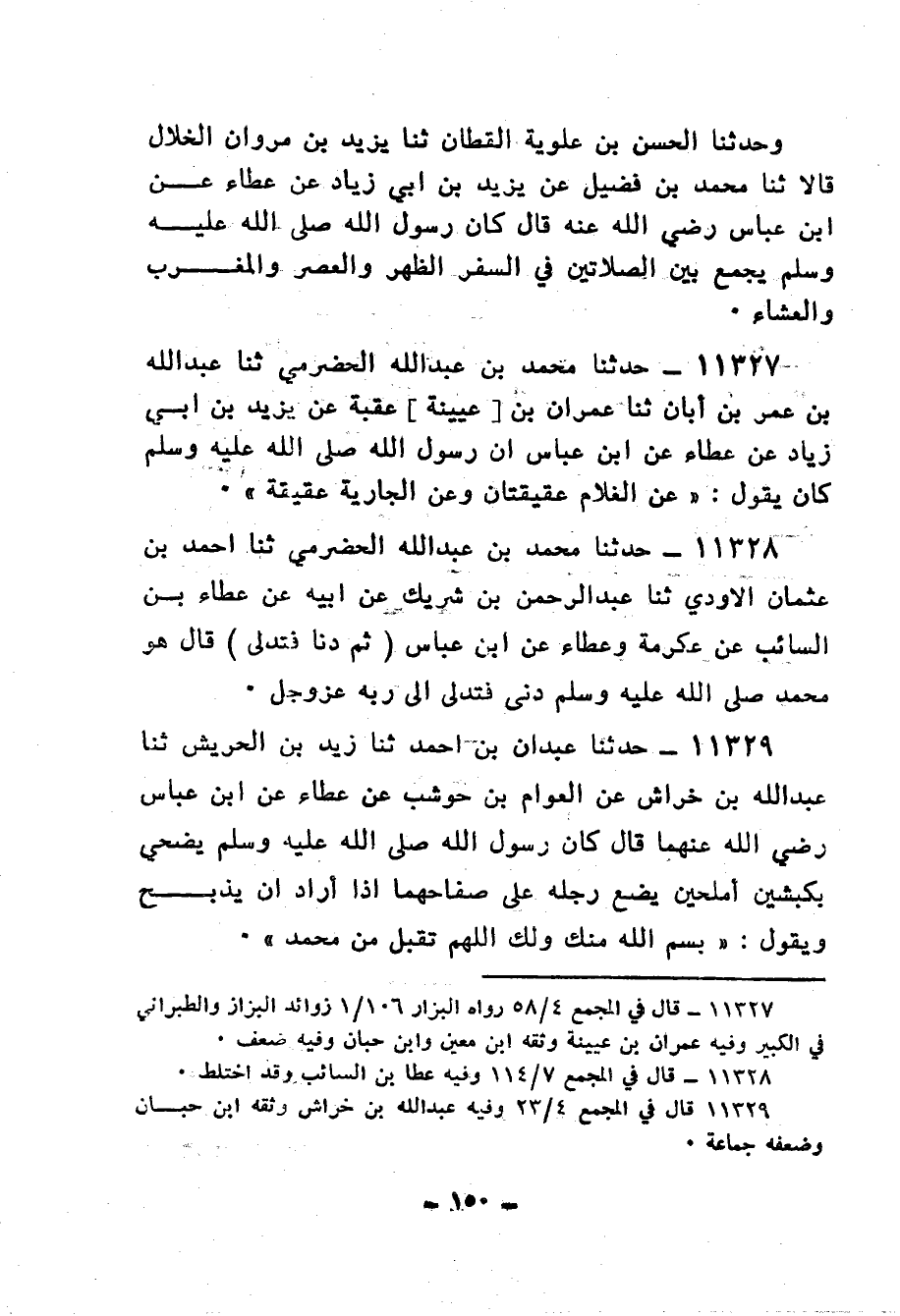 11329 - حَدَّثَنَا عَبْدَانُ بْنُ أَحْمَدَ، ثنا زَيْدُ بْنُ الْحَرِيشِ، ثنا عَبْدُ اللهِ بْنُ خِرَاشٍ، عَنِ الْعَوَّامِ بْنِ حَوْشَبٍ، عَنْ عَطَاءٍ، عَنِ ابْنِ عَبَّاسٍ رَضِي اللهُ عَنْهُما، قَالَ: كَانَ رَسُولُ اللهِ صَلَّى اللهُ عَلَيْهِ وَسَلَّمَ " يُضَحِّي بِكَبْشَيْنِ أَمْلَحَيْنِ يَضَعُ رِجْلَهُ عَلَى صِفَاحِهِمَا إِذَا أَرَادَ أَنْ يَذْبَحَ وَيَقُولُ: «§بِسْمِ اللهِ مِنْكَ وَلَكَ اللهُمَّ تَقَبَّلَ مِنْ مُحَمَّدٍ»