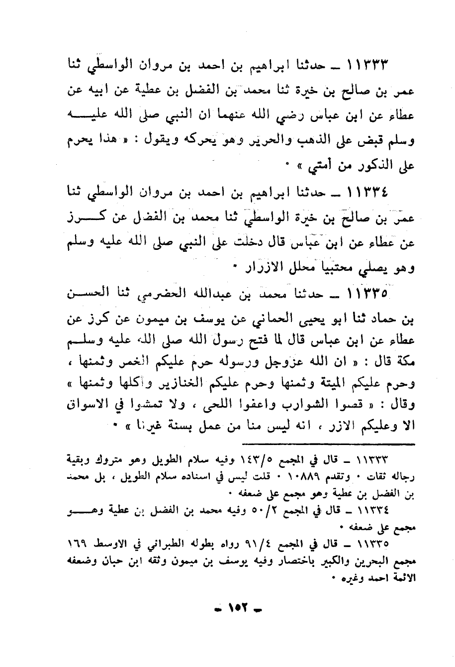 11333 - حَدَّثَنَا إِبْرَاهِيمُ بْنُ أَحْمَدَ بْنِ مَرْوَانَ الْوَاسِطِيُّ، ثنا عُمَرُ بْنُ صَالِحِ بْنِ خِيرَةَ، ثنا مُحَمَّدُ بْنُ الْفَضْلِ بْنِ عَطِيَّةَ، عَنْ أَبِيهِ، عَنْ عَطَاءٍ، عَنِ ابْنِ عَبَّاسٍ رَضِي اللهُ عَنْهُمَا، أَنَّ النَّبِيَّ صَلَّى اللهُ عَلَيْهِ وَسَلَّمَ قَبَضَ عَلَى الذَّهَبِ وَالْحَرِيرِ وَهُوَ يُحَرِّكُهُ وَيَقُولُ: «§هَذَا يَحْرُمُ عَلَى الذُّكُورِ مِنْ أُمَّتِي»