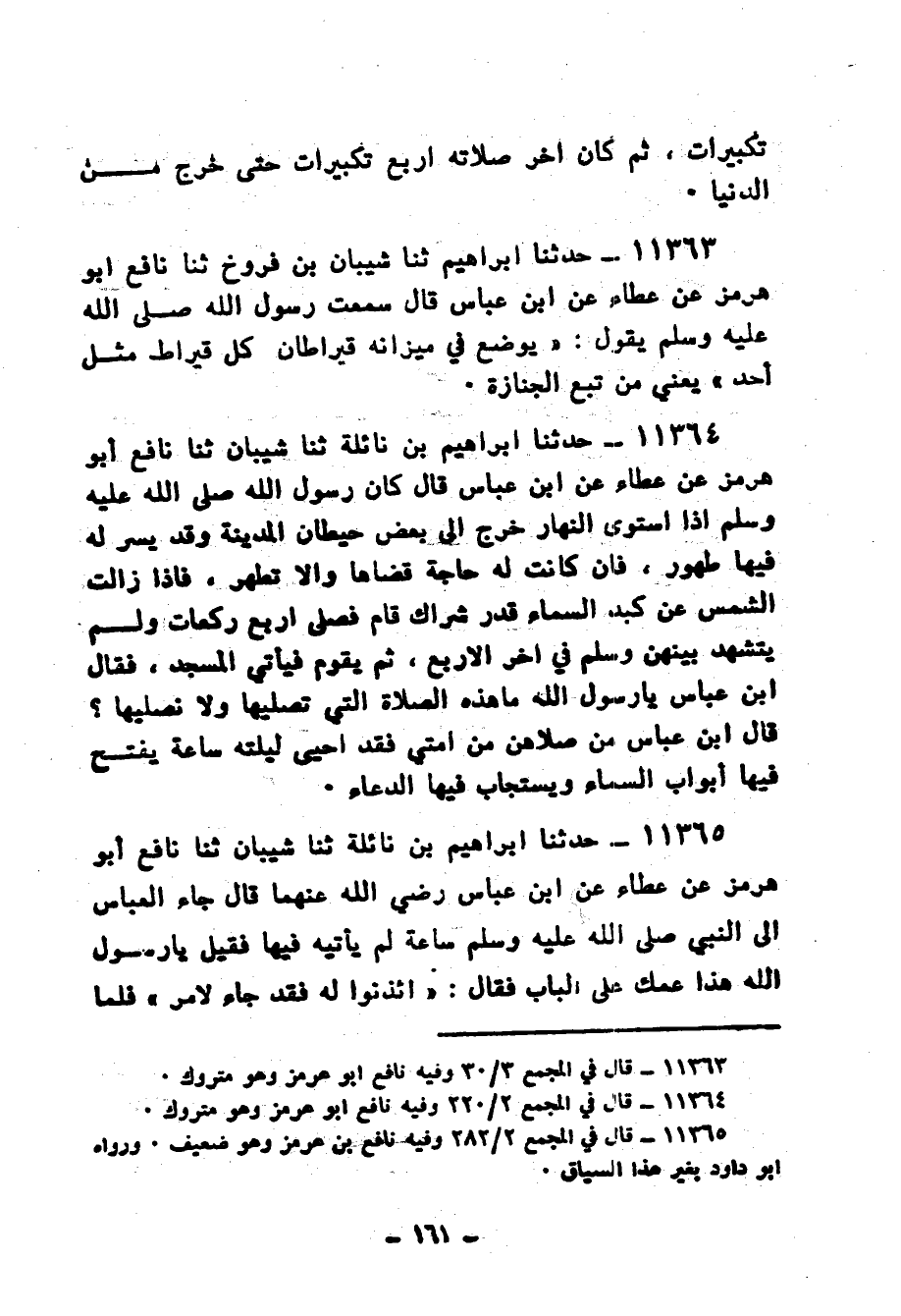 11364 - حَدَّثَنَا إِبْرَاهِيمُ بْنُ نَائِلَةَ، ثنا شَيْبَانُ، ثنا نَافِعٌ أَبُو هُرْمُزٍ، عَنْ عَطَاءٍ، عَنِ ابْنِ عَبَّاسٍ، قَالَ: كَانَ رَسُولُ اللهِ صَلَّى اللهُ عَلَيْهِ وَسَلَّمَ «إِذَا اسْتَوَى النَّهَارُ خَرَجَ إِلَى بَعْضِ حِيطَانِ الْمَدِينَةِ وَقَدْ يُسِّرَ لَهُ فِيهَا طَهُورٌ، فَإِنْ كَانَتْ لَهُ حَاجَةٌ قَضَاهَا، وَإِلَّا تَطَهَّرَ فَإِذَا زَالَتِ الشَّمْسُ عَنْ كَبِدِ السَّمَاءِ قَدْرَ شِرَاكٍ، قَامَ فَصَلَّى أَرْبَعَ رَكَعَاتٍ، وَلَمْ يَتَشَهَّدْ بَيْنَهُنَّ وَسَلَّمَ فِي آخِرِ الْأَرْبَعِ، ثُمَّ يَقُومُ فَيَأْتِي الْمَسْجِدَ» ، فَقَالَ ابْنُ عَبَّاسٍ: يَا رَسُولَ اللهِ، مَا هَذِهِ الصَّلَاةُ الَّتِي تُصَلِّيهَا، وَلَا نُصَلِّيهَا؟ قَالَ ابْنُ عَبَّاسٍ: «§منْ صَلَّاهُنَّ مِنْ أُمَّتِي فَقَدْ أَحْيَى لَيْلَتَهُ سَاعَةً يُفْتَحُ فِيهَا أَبْوَابُ السَّمَاءِ ويُستجابُ فِيهَا الدُّعَاءُ»