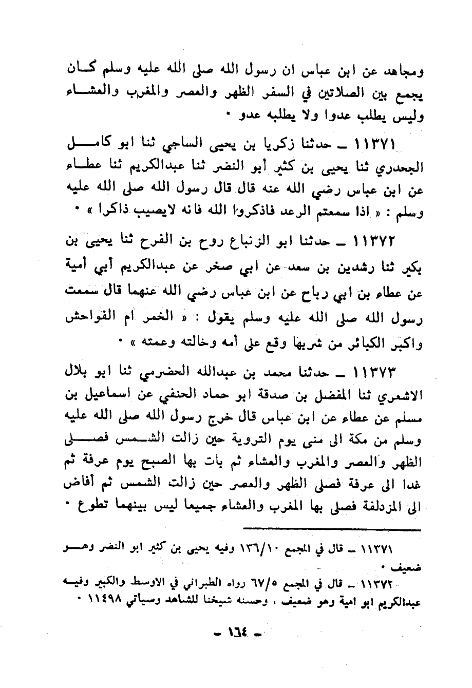 11373 - حَدَّثَنَا مُحَمَّدُ بْنُ عَبْدِ اللهِ الْحَضْرَمِيُّ، ثنا أَبُو بِلَالٍ الْأَشْعَرِيُّ، ثنا الْمُفَضَّلُ بْنُ صَدَقَةَ أَبُو حَمَّادٍ الْحَنَفِيُّ، عَنْ إِسْمَاعِيلَ بْنِ مُسْلِمٍ، عَنْ عَطَاءٍ، عَنِ ابْنِ عَبَّاسٍ، قَالَ: «خَرَجَ رَسُولُ اللهِ صَلَّى اللهُ عَلَيْهِ وَسَلَّمَ مِنْ مَكَّةَ إِلَى مِنًى يَوْمَ التَّرْوِيَةِ حِينَ زَالَتِ الشَّمْسُ، §فَصَلَّى الظُّهْرَ وَالْعَصْرَ وَالْمَغْرِبَ وَالْعِشَاءَ، ثُمَّ بَاتَ بِهَا الصُّبْحَ يَوْمَ عَرَفَةَ، ثُمَّ غَدَا إِلَى عَرَفَةَ فَصَلَّى الظُّهْرَ وَالْعَصْرَ حِينَ زَالَتِ الشَّمْسُ، ثُمَّ أَفَاضَ إِلَى الْمُزْدَلِفَةِ فَصَلَّى بِهَا الْمَغْرِبَ وَالْعِشَاءَ جَمِيعًا لَيْسَ بَيْنَهُمَا تَطَوُّعٌ»