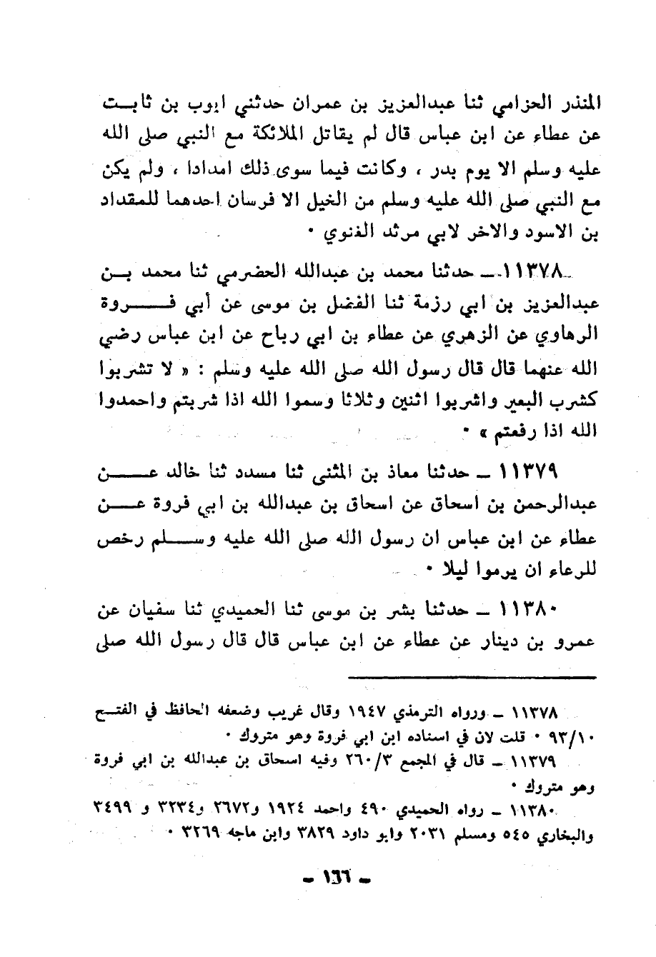 11378 - حَدَّثَنَا مُحَمَّدُ بْنُ عَبْدِ اللهِ الْحَضْرَمِيُّ، ثنا مُحَمَّدُ بْنُ عَبْدِ الْعَزِيزِ بْنِ أَبِي رِزْمَةَ، ثنا الْفَضْلُ بْنُ مُوسَى، عَنْ أَبِي فَرْوَةَ الرَّهَاوِيِّ، عَنِ الزُّهْرِيِّ، عَنْ عَطَاءِ بْنِ أَبِي رَبَاحٍ، عَنِ ابْنِ عَبَّاسٍ رَضِي اللهُ عَنْهُمَا، قَالَ: قَالَ رَسُولُ اللهِ صَلَّى اللهُ عَلَيْهِ وَسَلَّمَ: «§لَا تَشْرَبُوا كَشُرْبِ الْبَعِيرِ، وَاشْرَبُوا اثْنَيْنِ وَثَلَاثًا، وَسَمُّوا اللهَ إِذَا شَرِبْتُمْ، وَاحْمَدُوا اللهَ إِذَا رَفَعْتُمْ»