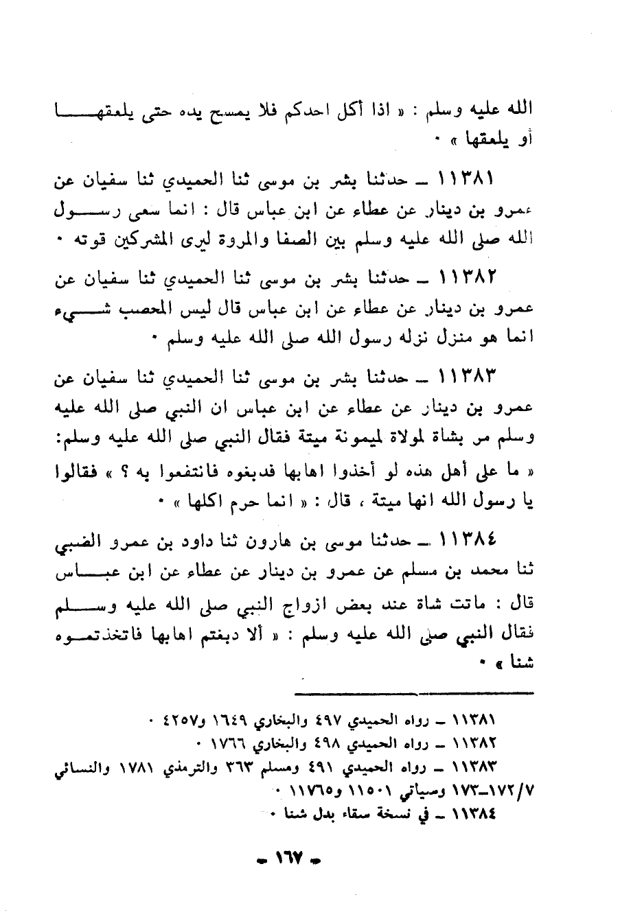 11383 - حَدَّثَنَا بِشْرُ بْنُ مُوسَى، ثنا الْحُمَيْدِيُّ، ثنا سُفْيَانُ، عَنْ عَمْرِو بْنِ دِينَارٍ، عَنْ عَطَاءٍ، عَنِ ابْنِ عَبَّاسٍ، أَنَّ النَّبِيَّ صَلَّى اللهُ عَلَيْهِ وَسَلَّمَ مَرَّ بِشَاةٍ لِمَوْلَاةٍ لِمَيْمُونَةَ مَيْتَةٍ، فَقَالَ النَّبِيُّ صَلَّى اللهُ عَلَيْهِ وَسَلَّمَ: «مَا عَلَى أَهْلِ هَذِهِ لَوْ أَخَذُوا إِهَابَهَا فَدَبَغُوهُ فَانْتَفَعُوا بِهِ؟» فَقَالُوا: يَا رَسُولَ اللهِ، إِنَّهَا مَيْتَةُ قَالَ: «§إِنَّمَا حُرِّمَ أَكْلُهَا»