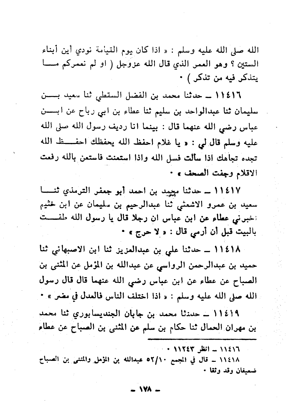 11416 - حَدَّثَنَا مُحَمَّدُ بْنُ الْفَضْلِ السَّقَطِيُّ، ثنا سَعِيدُ بْنُ سُلَيْمَانَ، ثنا عَبْدُ الْوَاحِدِ بْنُ سُلَيْمٍ، ثنا عَطَاءُ بْنُ أَبِي رَبَاحٍ، عَنِ ابْنِ عَبَّاسٍ رَضِي اللهُ عَنْهُمَا، قَالَ: بَيْنَمَا أَنَا رَدِيفُ رَسُولِ اللهِ صَلَّى اللهُ عَلَيْهِ وَسَلَّمَ قَالَ لِي: «يَا غُلَامُ، §احْفَظِ اللهَ يَحْفَظْكَ، احْفَظِ اللهَ تَجِدْهُ تُجَاهَكَ، إِذَا سَأَلْتَ فَسَلِ اللهَ، وَإِذَا اسْتَعَنْتَ فَاسْتَعِنْ بِاللهِ، رُفِعَتِ الْأَقْلَامُ وَجَفَّتِ الصُّحُفُ»